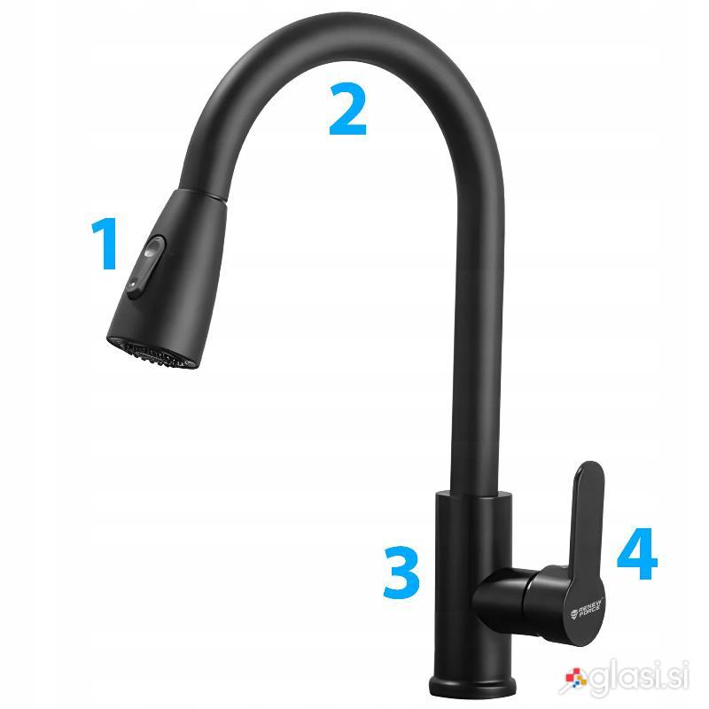 Pršenje (tuš) – idealno za hitro izpiranje zelenjave, sadja ali posode. Razpršen curek omogoča temeljito čiščenje.