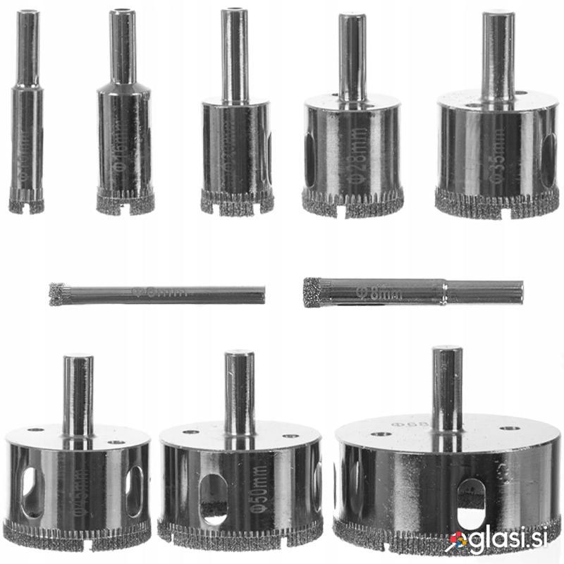 SPECIFIKACIJA - velikosti vrtalnih žag: 6, 8, 10, 16, 20, 28, 35, 45, 50 in 68 mm; ročaj: hitro zapenjanje; za delo: suho in mokro; namembnost: kamenina, steklo, keramične ploščice, terakota itd.; mere embalaže: 12,7 x 7,5 x 9,3 cm; teža kompleta: 420 g; teža v paketu: 458 g.