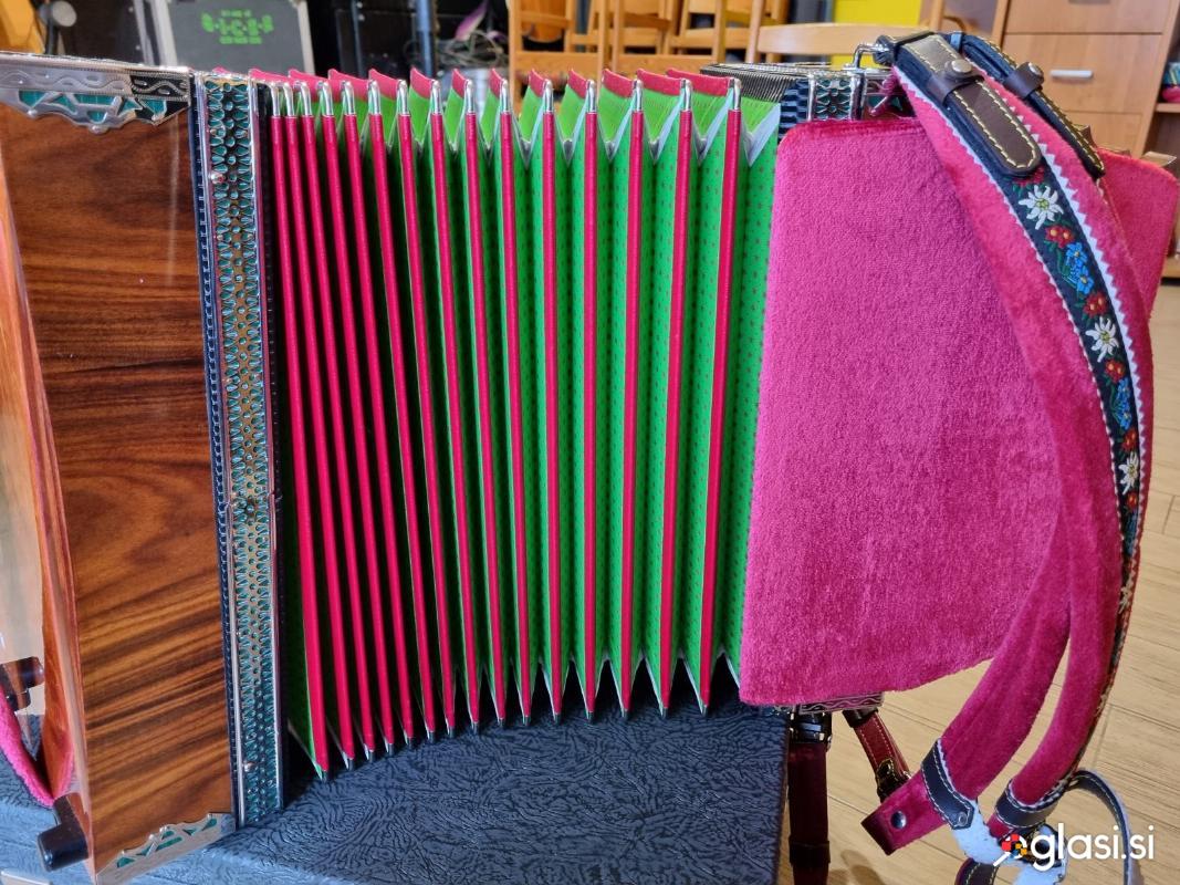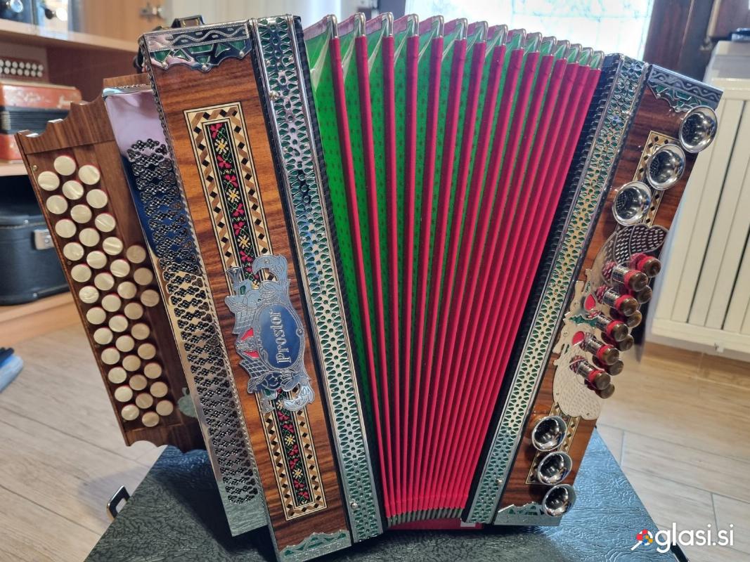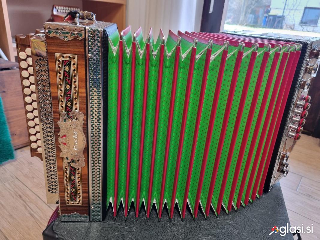 Harmoniko diatonično PROSTOR: Uglasitev: B-Es-As. Slakov zven. 3 dodatni gumbi. Starost 3 leta, izredno lepo ohranjena. S kovčkom in vezno spono. Samo resni