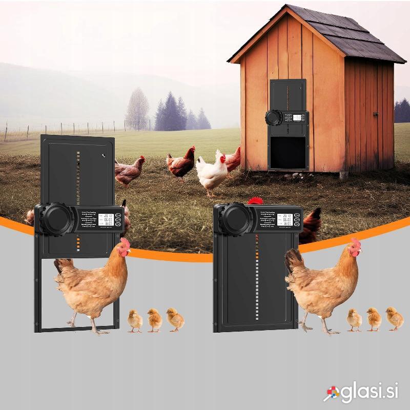 Ta inovativna vrata so zasnovana za maksimalno priročnost in zaščito. Z vgrajenim časovnikom jih lahko nastavite, da se samodejno odprejo zjutraj ob določeni uri in zaprejo zvečer, s čimer odpravite ročno delo. Vrata imajo tudi LCD zaslon, ki omogoča enostavno programiranje in prikazuje status. S tem boste vedno prepričani, da so vaše kokoši varne in spuščene ob pravem času.
