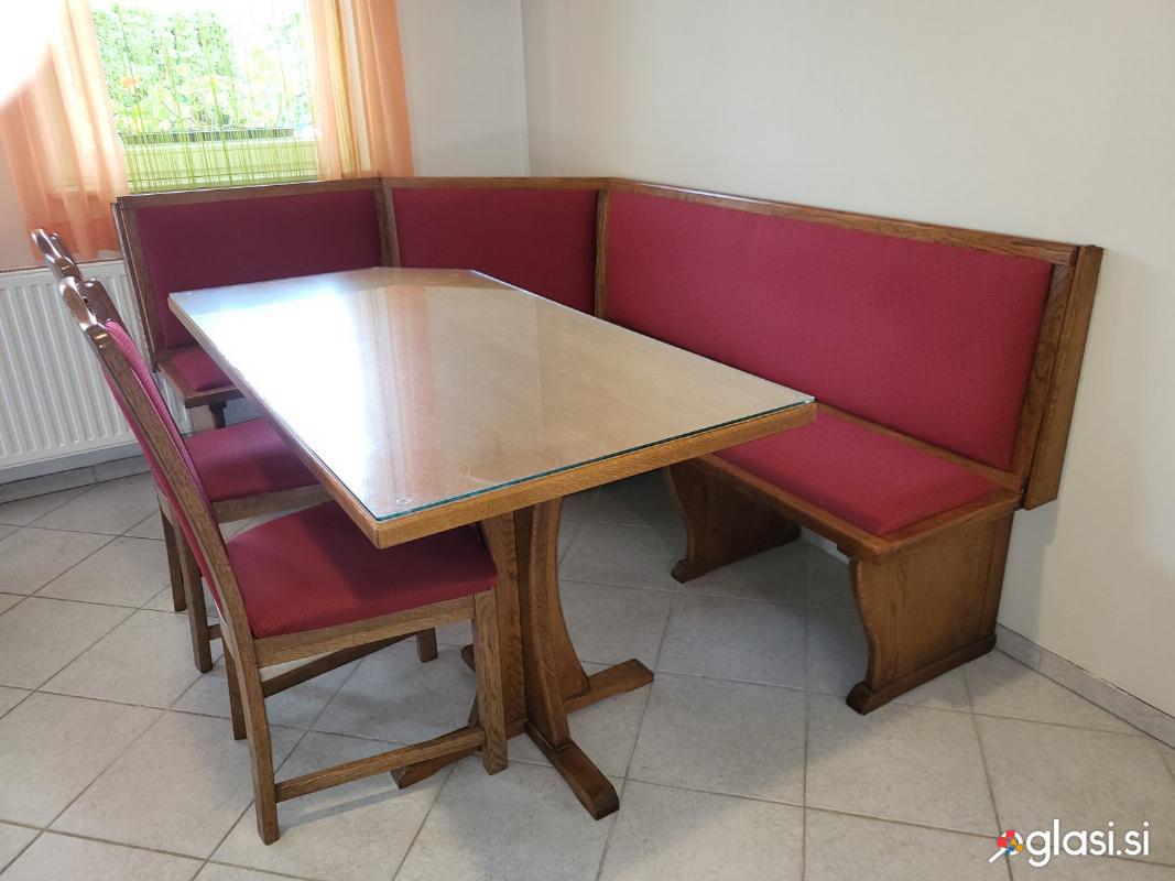 Jedilni kot iz hrasta, mizo in 2 stola, miza je zaščitena s steklom.