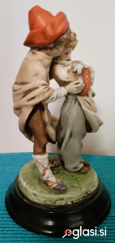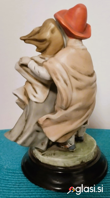 KIPEC Giuseppe Armani - fant in dekle * ročno poslikana figura iz porcelana dimenzije 14 x 25 cm Giuseppe Armani se je rodil v Calciju v Italiji leta 1935. Od trenutka, ko je mladi 'Bebe' lahko prijel svinčnik, je začel risati. Narisal je vse, kar je videl. Narisal je vse, ki jih je poznal. Ves dan je risal. Armanijevi starši so bili navdušeni nad Giuseppejevim osupljivim delom in so priznali, da so skice njihovega dečka več kot le nenavadne risbe večine otrok. Neverjeten realizem in pozornost do detajlov sta razkrila Giuseppejev pravi talent. Imel je darilo. Giuseppejevi učitelji so se odločili, da naj Armani obiskuje Akademijo za likovno umetnost v Firencah. Na žalost je v času priprave njegov oče nenadoma umrl. Družina je zdaj potrebovala Giuseppeja. Umetniška šola je bila pozabljena. Toda Art ni bil. Naravni talent Giuseppeja Armanija je bil končno prepoznan, ko je lokalni duhovnik organiziral razstavo mladih umetnikov; Giuseppe je vstopil v klasično navdahnjeno skulpturo moškega torza. Delo je bilo cenjeno zaradi izredne anatomske natančnosti. Ko so torzo odnesli v Umetnostno galerijo v Pisi, ki se nahaja čez cesto od znamenitega poševnega stolpa, je bil talent Giuseppeja Armanija nagrajen s ponudbo za stalno zaposlitev tam. Armanijeve sanje o študiju umetnosti so se končno uresničile v Pisi. Poglobil se je v velike mojstrovine renesanse, o katerih je bral le v knjigah. Potoval je v Sieno in Firence in začel brusiti svoj osebni slog; Giuseppe se je močno opiral na firenški renesančni slog 16. stoletja. Armani je spoznal, da mu kiparstvo omogoča delo v treh dimenzijah. V svoja dela je vnesel življenje, značaj in celo dušo. Giuseppe je eksperimentiral z lesom, glino, alabastrom in marmorjem, njegov ugled pa je rasel z vsako dih jemajočo stvaritvijo. Občudovalci umetnosti so se kmalu začeli zgrinjati v galerijo, da bi si ogledali Armanijeva najnovejša dela. Leta 1975 mu je florentinska Sculture d'Arte priznala Armanijev genij in mu ponudila priložnost, da dela izključno zanje. Spodbudil bi ga, naj pusti svoji umetniški muzi prosto pot. Giuseppe Armani je sprejel. Armani že več kot 20 let ustvarja mojstrovine, ki segajo od tradicionalnega sloga Capodimonte do bolj drznih, sodobnih, včasih čudaških skulptur. Giuseppe je svojim figuricam vedno vlival dih jemajoč realizem -- iskrico življenja. To še naprej preseneča tudi njegove številne oboževalce po vsem svetu. Giuseppe Armani takole opisuje svoj credo: »Čeprav se imam za neposrednega potomca renesančne dediščine, menim, da mora umetnik slediti lastni evoluciji in ne biti zgolj preživelec preteklosti, ne glede na to, kako veličastna je bila. Umetnik sledi iskanju, ki ga lahko popelje daleč v raziskovanje novih področij zanimanja. Nenehno iščem nove in boljše načine izražanja.