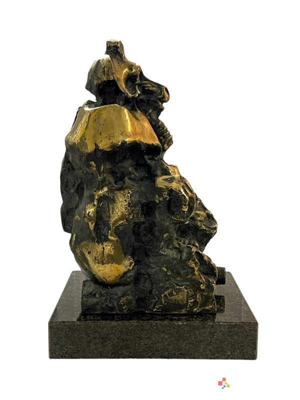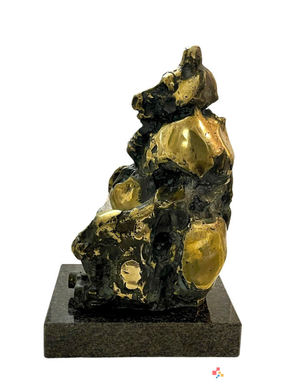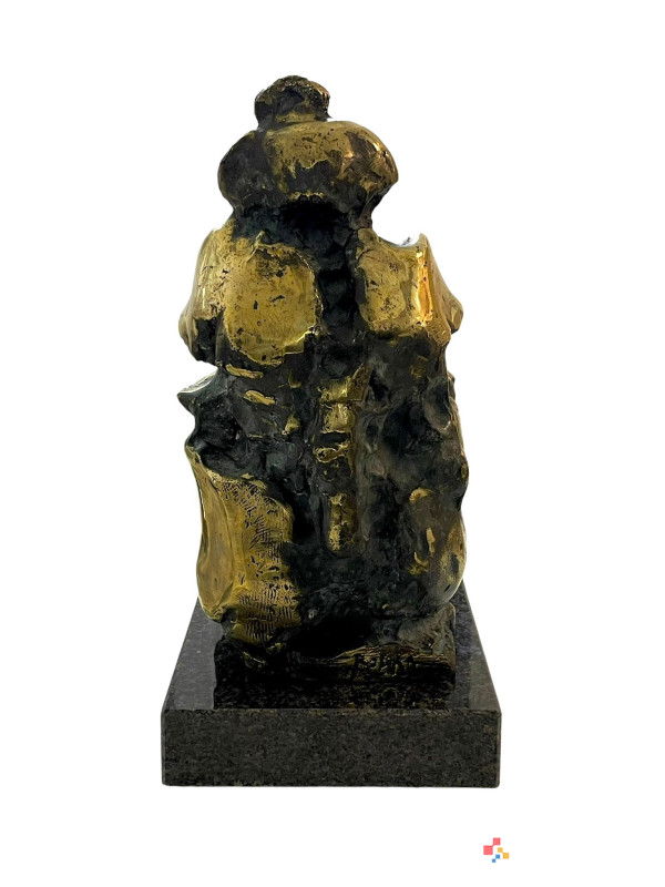 Skulptura bronasta Janez Boljka - * Opičji kralj, višina 35 cm, teža cca 11 kilogramov. BOLJKA, Janez, kipar, grafik, slikar (r. 21. 6. 1931, Subotica, Srbija; † 20. 8. 2013, Ljubljana). Oče Miha Boljko, strojni tehnik, mati Terezija, roj malo. Stric Miha Maleš, slikar, sin Miha Boljko, slikar. Po drugi svetovni vojni se je družina preselila v Ljubljano, kjer se je Boljka po končani gimnaziji leta 1951 vpisala na Akademijo za likovno umetnost, smer kiparstvo. Diplomiral je leta 1956 pri Karlu Putrihu in pri njem leta 1959 končal specialko za kiparstvo ter specialko za grafiko pri Riku Debenjaku (1959–61). Leta 1961 se je s štipendijo Mošeta Pijadeta izpopolnjeval v Franciji in Angliji. Leta 1966 se je pridružil skupini BE-54. Vsa leta je bil v svobodnem poklicu. Že zgodaj je presenetil z inovativnim pristopom - varil je dele orožja (razstave v Beogradu, Subotici, Zagrebu in Ljubljani, 1963) in s tem izražal svoj antimilitarizem. Dele orožja je kmalu zamenjal z železnimi elementi, odpadnimi deli industrijskih izdelkov, ki jih je sestavljal v figure. Velja za pionirja uporabe železa v kiparstvu v šestdesetih letih prejšnjega stoletja v Jugoslaviji. Leta 1960 so na Jesenicah posneli kratki film o njegovem delu Železni kraj, ki je bil prvič prikazan šele leta 1990 na retrospektivni razstavi v Kostanjevici na Krki. Konec šestdesetih let prejšnjega stoletja je kovano železo zamenjal z bronom. V ateljeju v Rožni dolini (prej ga je uporabljal Jakob Savinšek) sta s Petrom Černetom postavila livarno. Boljka je tudi med pionirji uporabe aluminija. Zgodnja plastika je vpeta v mrežo vertikal in horizontal. V delih zrelih let je razčlenjena in delno močno polirana površina odprta v notranjost; jedkana struktura ustvarja svetlobne učinke, poliranje povzroča zrcaljenje. V poznem opusu se na površini multiplicirajo aplicirani medaljoni, kovanci in predmeti iz ljudske zakladnice, s čimer se stopnjuje napetost med (pre)obloženo kožo in izdolbeno notranjostjo. Boljkova dela izražajo eksistencialno tesnobo, opozarjajo na razčlovečenost sodobnega sveta, strah pred atomsko kataklizmo in vsakršnim zlom in uničenjem, v skladbah pa je zaznati tudi humor in vero v boljšo prihodnost. Ustvaril je nekaj značilnih likov, večnih iskalcev in sledilcev višjih ciljev. Folklorno podobo Ribničanov je nadgradil v podobo večnega popotnika; njegov deseti brat je podoben njemu. Atomska Venera se spogleduje s prazgodovinskimi idoli in lepoto čutnega ženskega akta, obremenjenega z grozo atomske dobe. Zanimanje za atomsko dobo se kaže tudi v kipu, ustvarjenem za Forma vivo Maribor (1975); struktura atoma aluminija je pritrjena na fasado stavbe Jemčev vrt (arhitekt Borut Pečenko). Atomska stavba je tudi del bronaste Atomske Venere pred stavbo Svetovnega trgovinskega centra v Ljubljani (1989–93). Stalnica je lik Ivana Cankarja. Na dveh spominskih natečajih (1968 in 1971) je prejel drugo nagrado, leta 1974 je v Beogradu, nato pa v Mali galeriji v Ljubljani, razstavil trinajst novih idej. Pisateljevo stilizirano in votlo, a prepoznavno postavo včasih spremlja muza, pogosto pa jo je približal liku Kristusa. Za izvedbo je bila izbrana figura na podstavku, ki naj bi vzniknila iz vode (predvidena lokacija na sedanjem Kongresnem trgu, arhitekt France Richter). Jože Kloboves je posnel televizijski film (1974) o nastanku Boljkovega Cankarjevega spomenika. Ker je žirija ob hkratni javni polemiki zahtevala umik avtorjeve osebne note, je Boljka od projekta obupala. Likoma Riharda Jakopiča in Gabrijela Stupice se je poskušal približati formalno; Impresionistične prvine je mogoče razbrati tudi v drugih kipih v eroziji kiparske gmote, ki se v slikoviti igri svetlobe in sence izmika materialni določljivosti. Očeta je upodobil kot saksofonista (glasbenika). Tu so tudi krščanski motivi: Križanje, Mati in otrok, Pietà; Mary ima na obrazu pogosto plinsko masko (Madonna iz Hirošime, 1980). Živali so ga zanimale že med študijem. V drugi polovici šestdesetih let 20. stoletja se je rodil prvi živalski cikel, v osemdesetih letih se je zanimanje za živali okrepilo; upodabljal jih je v bronu in aluminiju, v grafiki in olju. Najpogostejši so opice (z veliko ironije), biki in nosorogi (v napadalnih položajih kot simboli neizmerne moči), netopirji, zajci, miši in konji; slednji tudi v skupinah, z jezdeci, v igrivih in padajočih držah. V letih 1991, 2000 in 2003 je oblikoval podobe živali za tolarske kovance. V devetdesetih letih 20. stoletja je ustvaril cikel male plastike z erotičnimi motivi (Metamorfoze): v grotesknih in celo nasilnih erotičnih zgodbah je združeval človeška in živalska telesa ter jih postavljal na razkošne zofe; nosorogi blestijo pri parjenju. Eksperimentiral je z malo plastiko (Akupunktura glave/Vlastita slika, 1980) in se preizkusil v obvladovanju prostora: dodal je senco, odtisnjeno v dnu figure (Sence). Boljkove grafike sodijo v t. I Grafična šola Ljubljana. Najprej je delal v barvni akvatinti, nato sitotisk dopolnjen s suho iglo.