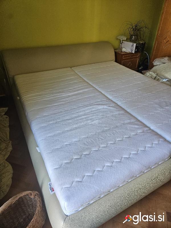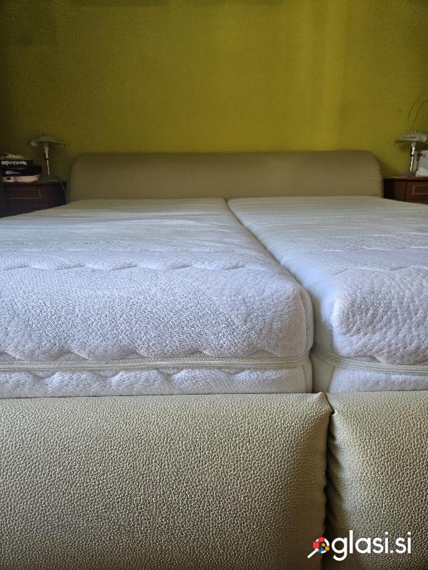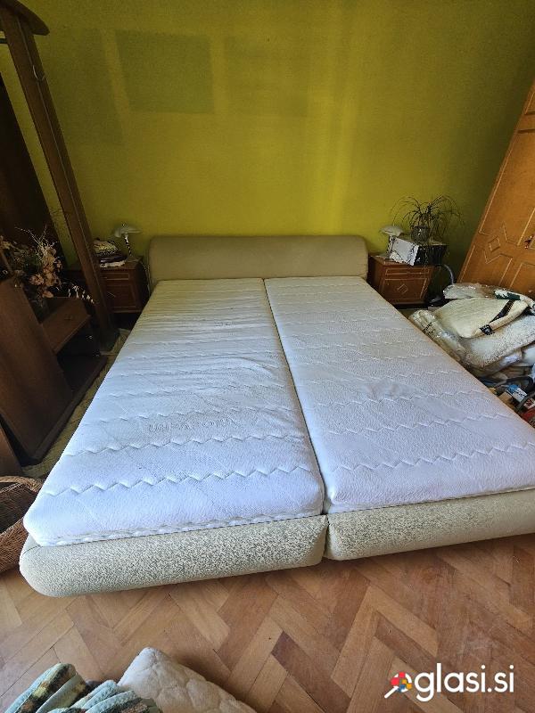 Posteljni okvir, usnjen, v velikosti 180×200 cm, skupaj z dvema jogijema 90 cm × 200 cm. Rabljeno, ampak v zelo dobrem stanju.
