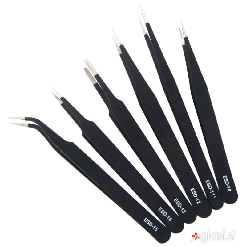 Profesionalni set pincet za servisiranje in modeliranje. V kompletu je 6 ravnih in diagonalnih pincet, potrebnih za vsako elektroniko. Orodja bodo uspešna pri manjših natančnih popravilih (npr. sistemi za spodkopavanje). Izdelan iz antistatičnega materiala (ESD), ki preprečuje elektrostatično razelektritev.