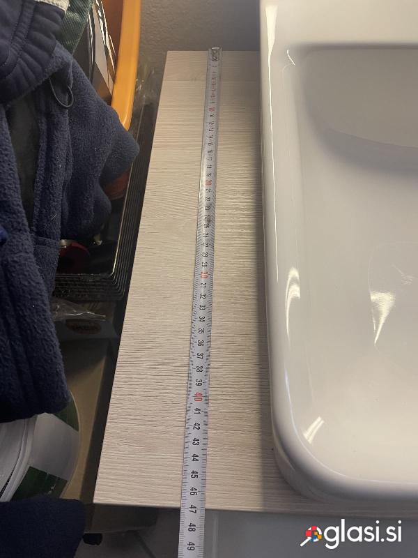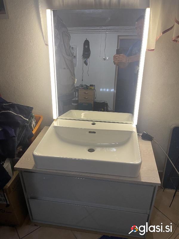 Ogledalo kopalniško, z razsvetljavo, umivalnik ter kopalniško omarico z dvema predaloma. Dimenzija 47 x 80 cm.