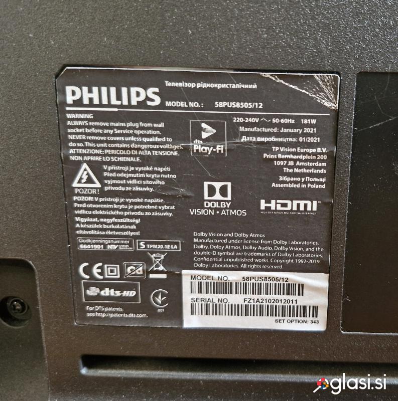 TV Philips 58PUS8505/12, 76x130cm, nedelujoč procesor, za rezervne dele.