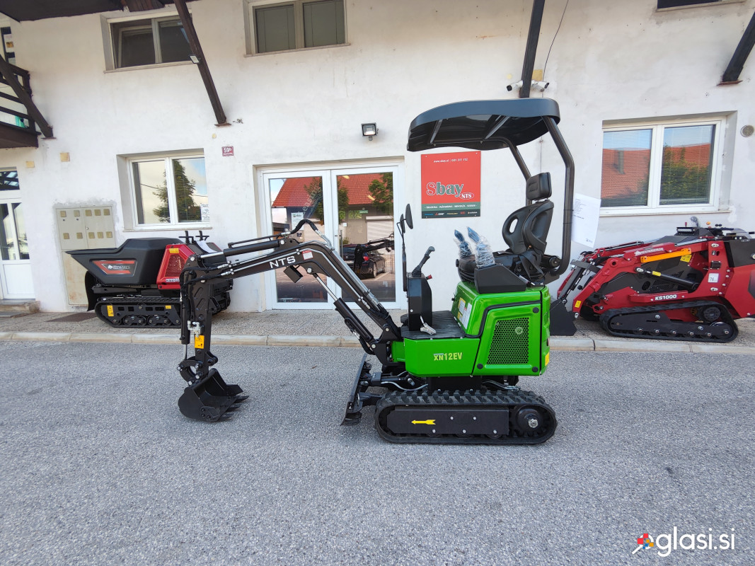 Električni bager XN12EV je zasnovan za majhne projekte, vrtove, komunalna dela na kmetijskih zemljiščih itd. Uporablja se lahko tudi na igrišču in v javnih parkih. Preprost dizajn, enostavno za vzdrževanje. XN12EV je popolnoma električni bager s 17,66 kWh, litijevo baterijo ter delovnim časom približno 5-6 ur. Bager ima različne priključke, kot so ozka žlica, izravnalna žlica, nagibna žlica, hitri priklop, polž, kladivo... Mehansko upravljanje in krmilna palica. TEHNIČNI PODATKI: Delovna teža: 1240 kg Standardna prostornina žlice: 0,02 cbm Oblika delovne naprave: rovokopač ELEKTROMOTOR: Št. modela: TZXQD112-6-1.0T-9 Nazivna moč: 4kw maks. navor: 38N.m Nazivna hitrost: 2100rpm HITROST IN SILA KOPANJA: Hitrost nihanja: 10rpm maks. razred sposobnost: 30% maks. hitrost vožnje: 1,5 km/h GOSENICE: Tlak na tla: 30,11Kpa Material gosenic: guma Tip napenjalca: Vijak BATERIJA: Kapaciteta baterije: 16,56kwh Delovni čas: 5-6h Čas polnjenja 220V: 6h(vgrajen polnilnik) Vrsta baterije: Litij-ionski napajalni sistem KAPACITETA HIDRAVLIKE IN TEKOČINE: Vrsta črpalke: zobniška črpalka Tlak: 16Mpa Pretok: 16L/min Prostornina rezervoarja za hidravlično olje: 13L GLAVNA DIMENZIJA: A Maks. polmer kopanja na tleh: 3038 mm B Maks. polmer kopanja: 3136 mm C Maks. globina kopanja: 1522 mm D Maks. višina kopanja: 2650 mm E Maks. višina odlaganja: 1880 mm F Maks. vertikalna globina kopanja: 1328 mm G Min. nihajni polmer: 1510 mm H Maks. višina dviga rezila: 140 mm Jaz Max. globina dviga rezila: 230 mm GLAVNA DIMENZIJA: a Medosna razdalja: 910 b Dolžina proge: 1235 c Oddaljenost zgornjega dela šasije od tal: 458 d Polmer vrtenja repa: 695 e Širina šasije: 800/950 f Širina koloteka: 180 g Višina gosenice: 320 h Transportna dolžina: 2170/2820 i Višina sedeža do tal: 1589 j Skupna višina: 2295 k Nihanje ogrodja v levo: 49° I Boom nihanje desno: 56° m dolžina šasije: 1078