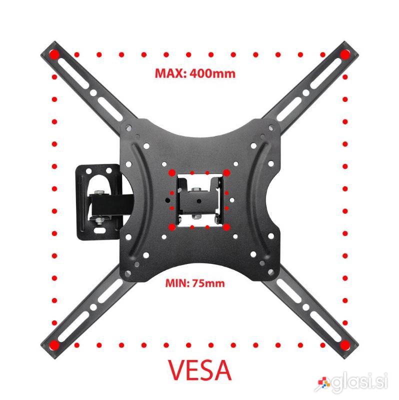 Kovinski, robusten stenski nosilec za televizorje velikosti od 26" do 70". Enostaven za namestitev. Združljiv s standardom VESA 75x75mm - 400x400mm. Priložena je majhna vodna tehtnica za enostavno izravnavo nosilca. Nosilec ima nastavljiv naklon, nastavitev kota odklona vodoravno in nastavljivo oddaljenost televizorja od stene.
