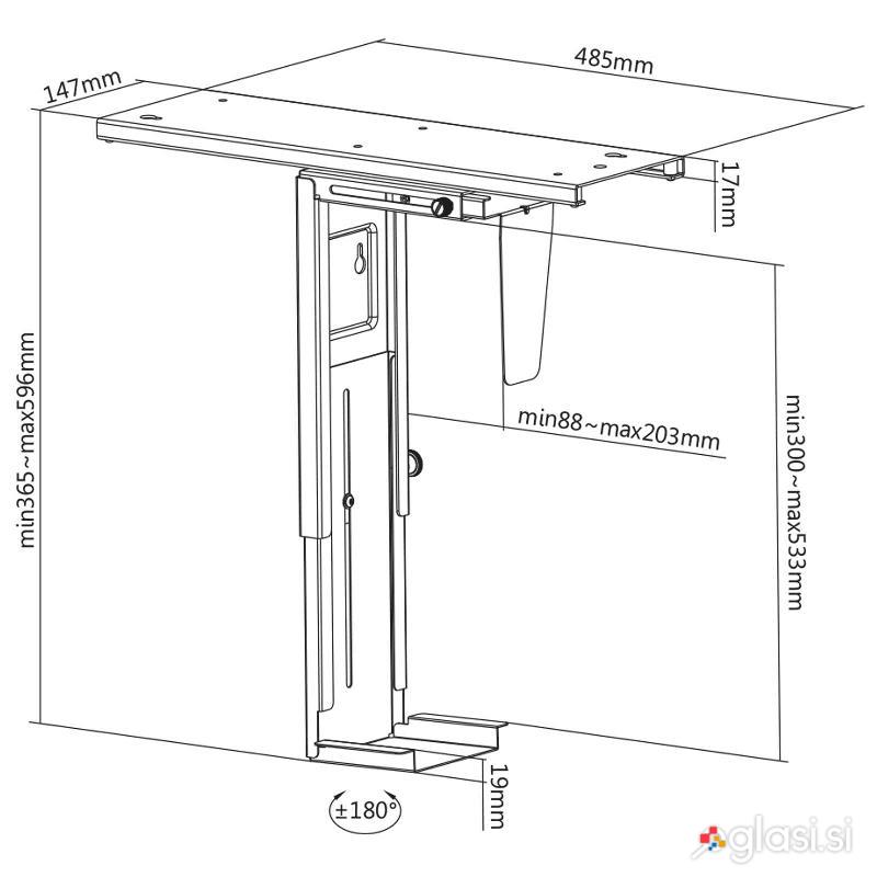 Zahvaljujoč nastavitvi višine lahko držalo za računalnik individualno prilagodite ohišju računalnika. Širina je nastavljiva tudi brez orodja. Zaradi tega je univerzalno držalo za računalnik primerno za večino osebnih računalnikov.