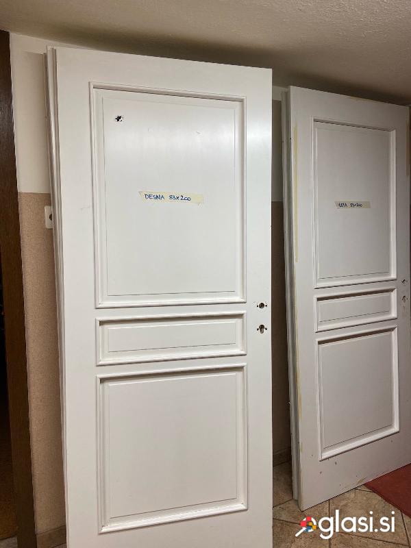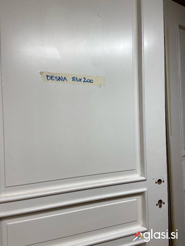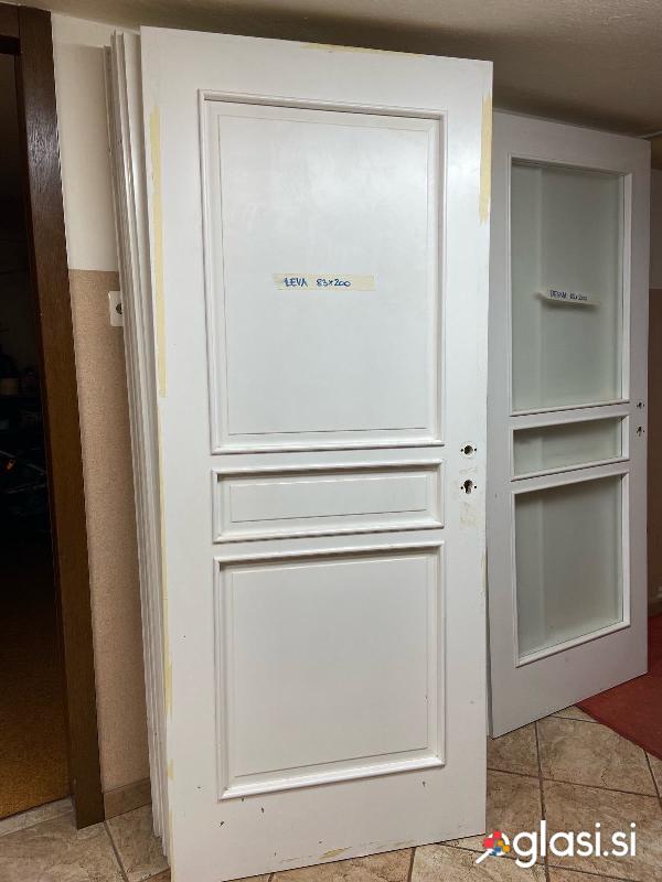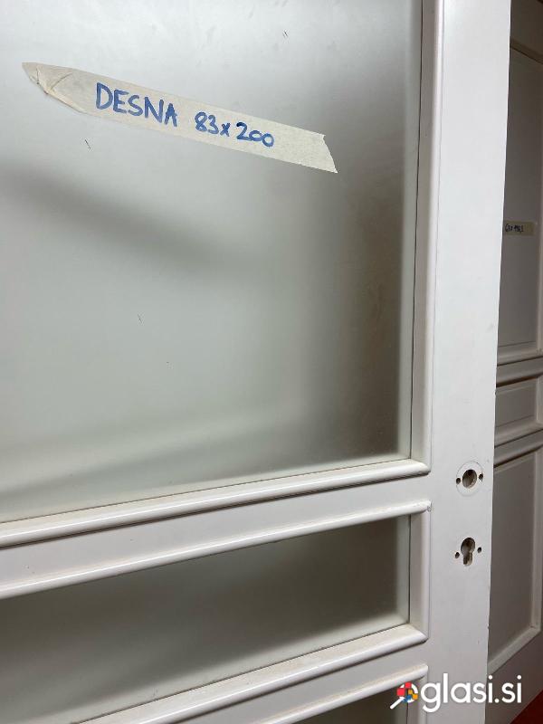 Notranja vrata, lepo ohranjena, lesena . Brez kljuk in podbojev. Dimenzije so napisane na posamezni sliki. Belo lakirana, 2 kom s steklom.