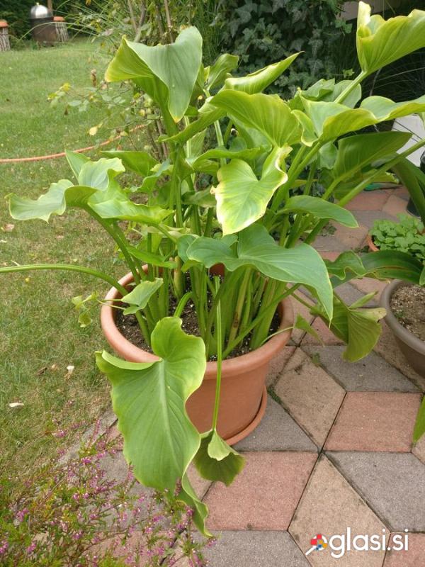 Veliko belo Callo / Zantedešijo (znano tudi kot Kala lilija), v loncu. Prva slika je simbolična in prikazuje cvetenje, na drugi in tretji sliki pa lahko vidite rastlino, ki jo boste dobili. Visoka je 50 cm.