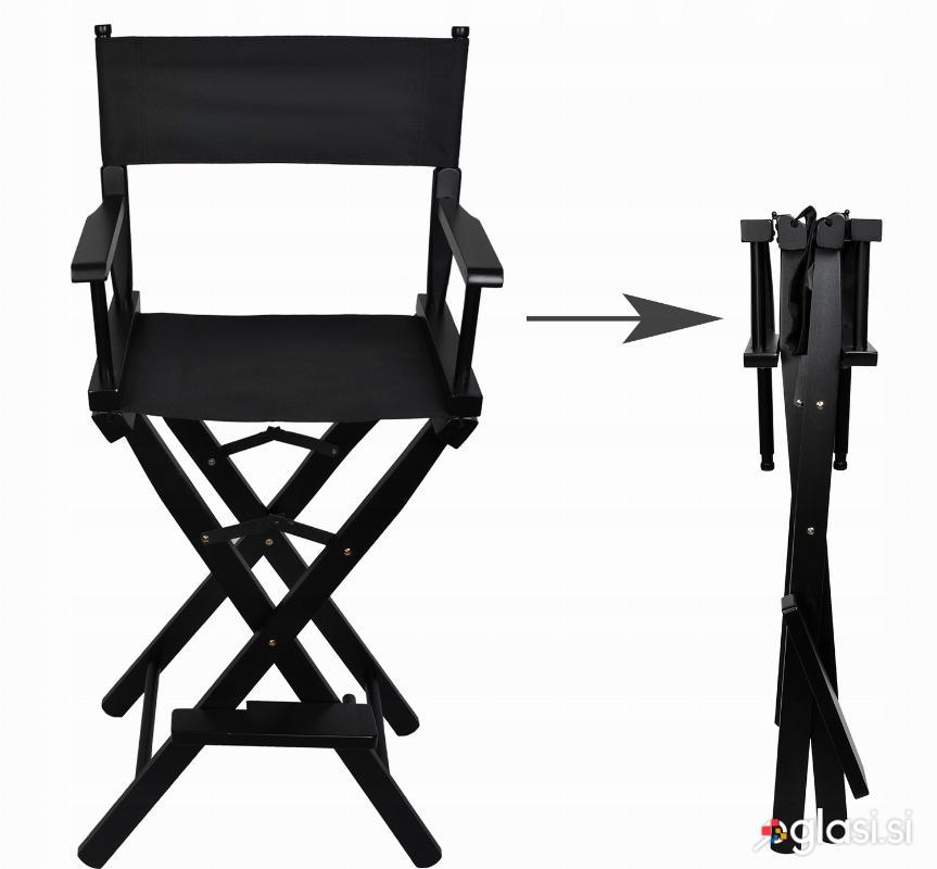 ZLOŽLJIV STOL ZA LIČENJE - Naš izjemno močan in udoben stol za ličenje, ličenje in ličenje se bo odlično obnesel tudi kot režiserski stol. Izdelan je iz najkvalitetnejšega bukovega lesa in črnega aluminija. Sedež je izdelan iz vodoodpornega materiala Oxford 600D. Izdelek ima nosilnost do 140 kilogramov! Ker je izdelan iz lesa, ima izjemno močno strukturo, ki zagotavlja udobje za sedečo osebo. Noge na dnu ga naredijo stabilnega in zagotavljajo varnost med uporabo.
