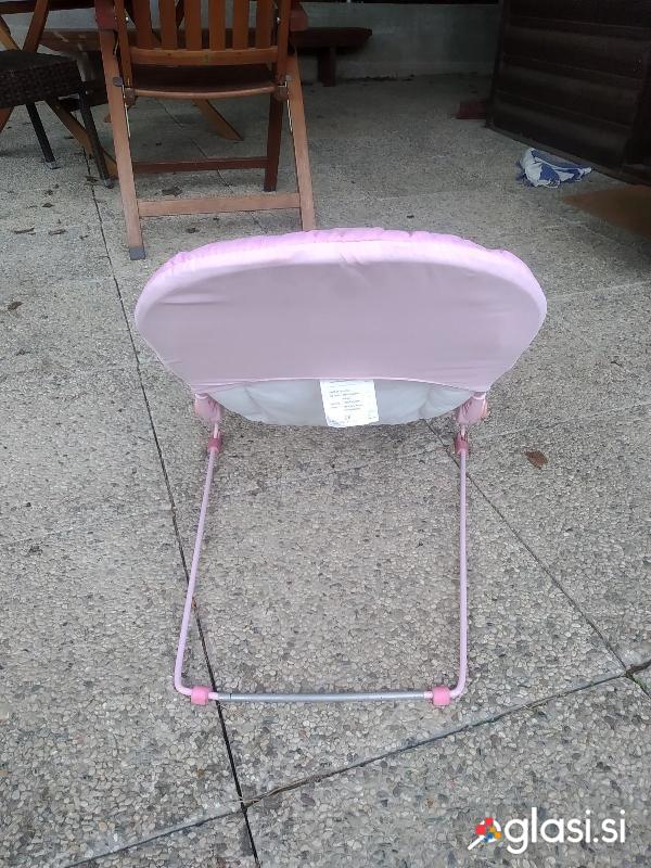Gugalnik, stabilen in čist. Tkanina je sveže oprana in se jo da odstraniti z ogrodja. Spredaj pri nogicah se namesti zvočnik z vibratorjem, ki igra animirane melodije in potresava otroka. - manjka lok kamor se obesi igračke nad otrokom. OGRODJA NI MOGOČE RAZSTAVITI.