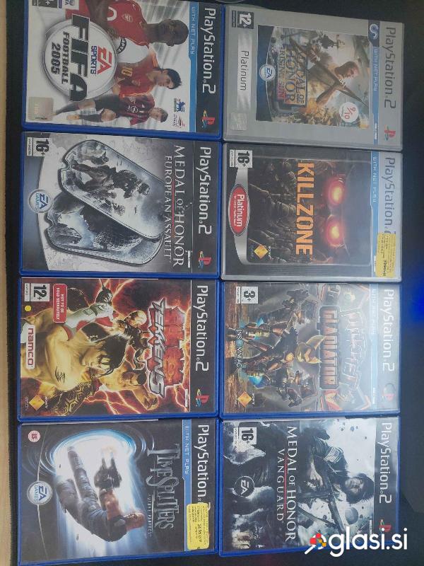Playstation 2 slim , 40eur, 4 kontrolerji, 20eur 1, zraven pridejo kabli in razdelilec za kontrolerje . Medal of honor risinc sun 5eur Fifa football 2005 10eur Killzone 5 eur Medal of honor european assault 5eur Rathchet gladiator 10eur Tekken 5 20eur Medal of honor vanguard 5eur Time Splitters 15eur