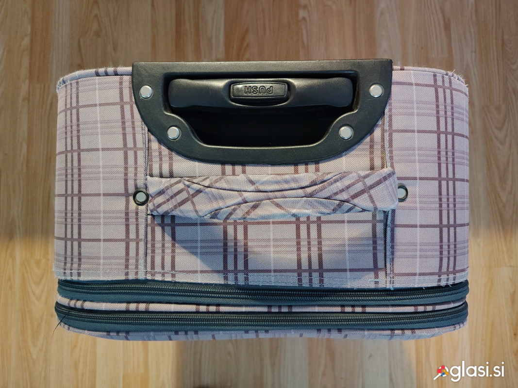 Platneni potovalni torbi, dobro ohranjeni . Vse zadrge delujejo, brez večjih znakov uporabe. Ponudba iz oglasov: 1. modri potovalni kovček z ročko in koleščki Dimenzije: -višina: 65 cm -širina: 41 cm -globina: 22 cm Teža: cca. 3 kg 2. karirasti rjavi potovalni kovček z ročko in koleščki Dimenzije: -višina: 65 cm -širina: 41 cm -globina: 22 cm Teža: cca. 3 kg Posamezna potovalna torba se vrednoti na 10,00 evrov. Možen osebni prevzem ali pošiljanje po predhodnem nakazilu. Nudiva možnost tudi sodobnejših oblik plačila prek mBills, AirCash, PayPal, Paysera, Paysend, UPN, TRR,...po povzetju žal ne pošiljava. Flik ne uporabljava.