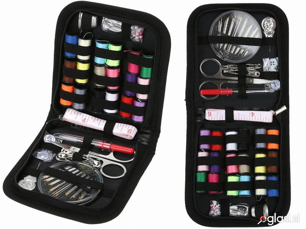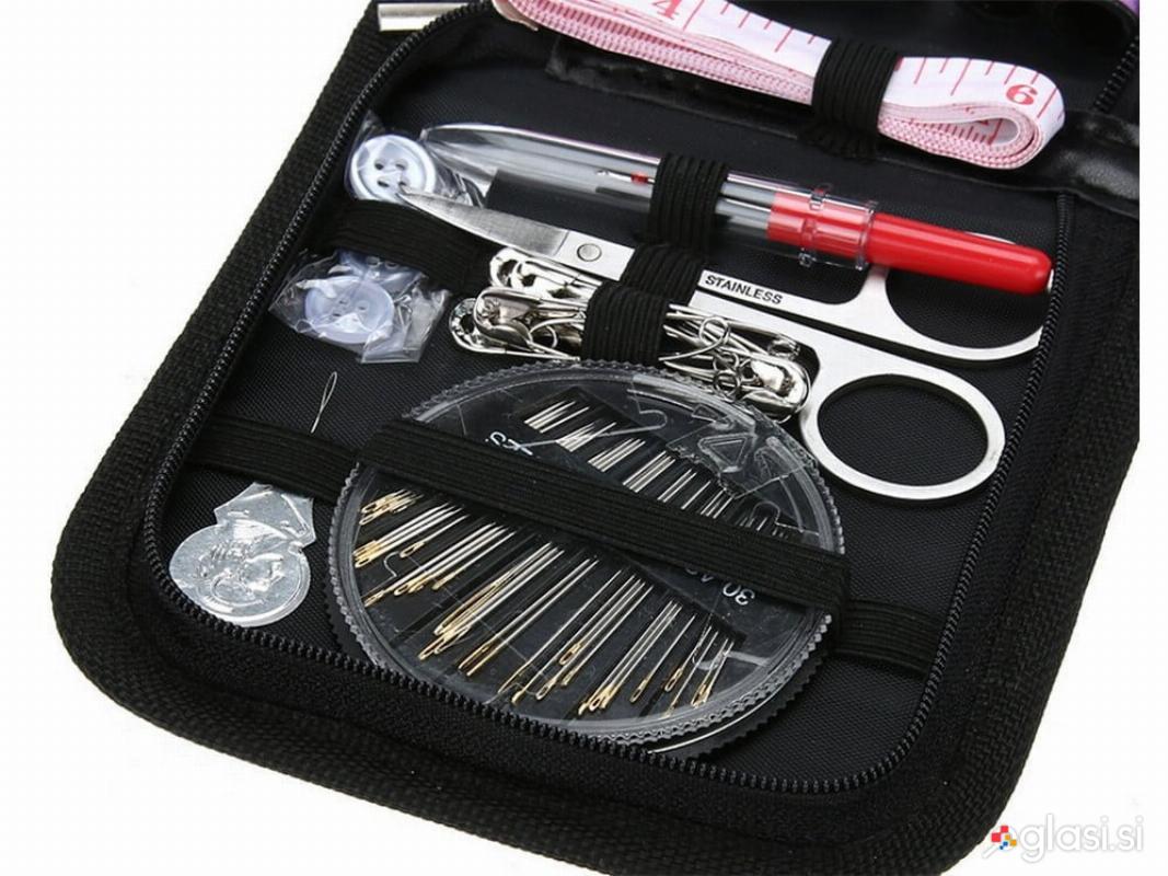 Celoten komplet dopolnjuje komplet 30 ostrih igel različnih velikosti v okrogli škatli in 2 vdevalnika niti.