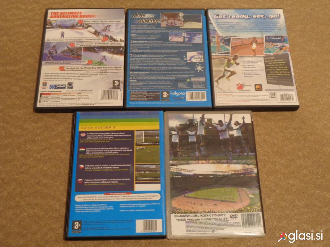 IGRE za računalnik: Ski Racing 2005, Winter challenge 2008, Summer Athletics, Actua Soccer 3, Euro 2008. Igre so zelo lepo ohranjene, 5€ za kos ali po dogovoru.