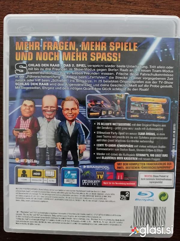 Playstation 3: Schlag den Raab - Das 2.Spiel. Gre za kombinacijo kviza in zanimivih TV iger po vzoru izjemno priljubljenega nemškega TV formata - oddaje Schlag den Raab. Izdelek je lepo ohranjen, brez pomanjkljivosti in krasna zabava za vso družino. Pošljem po pošti, lahko po povzetju ali pa ob nakazilu plačila na moj trr račun stroški pošiljanja samo 3€.