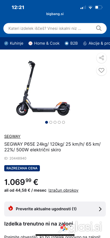 Električni skiro Segway . Praktično nov, odprta embalaža. Ni vožen / brez poškodb. Močan motor, doseg do 65 km. Trgovinska cena 900€+. Kranj / Ljubljana. Možen osebni prevzem.