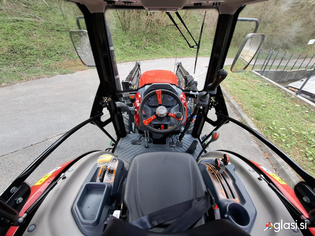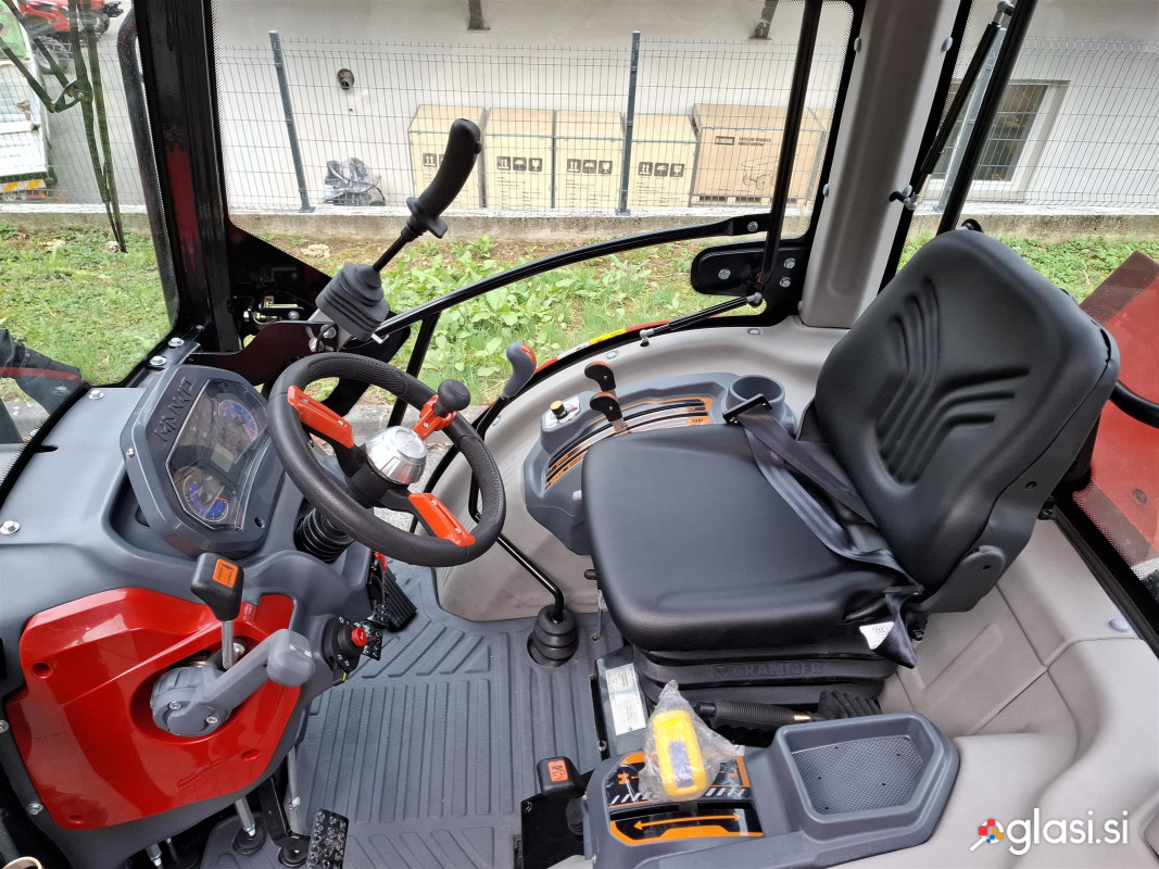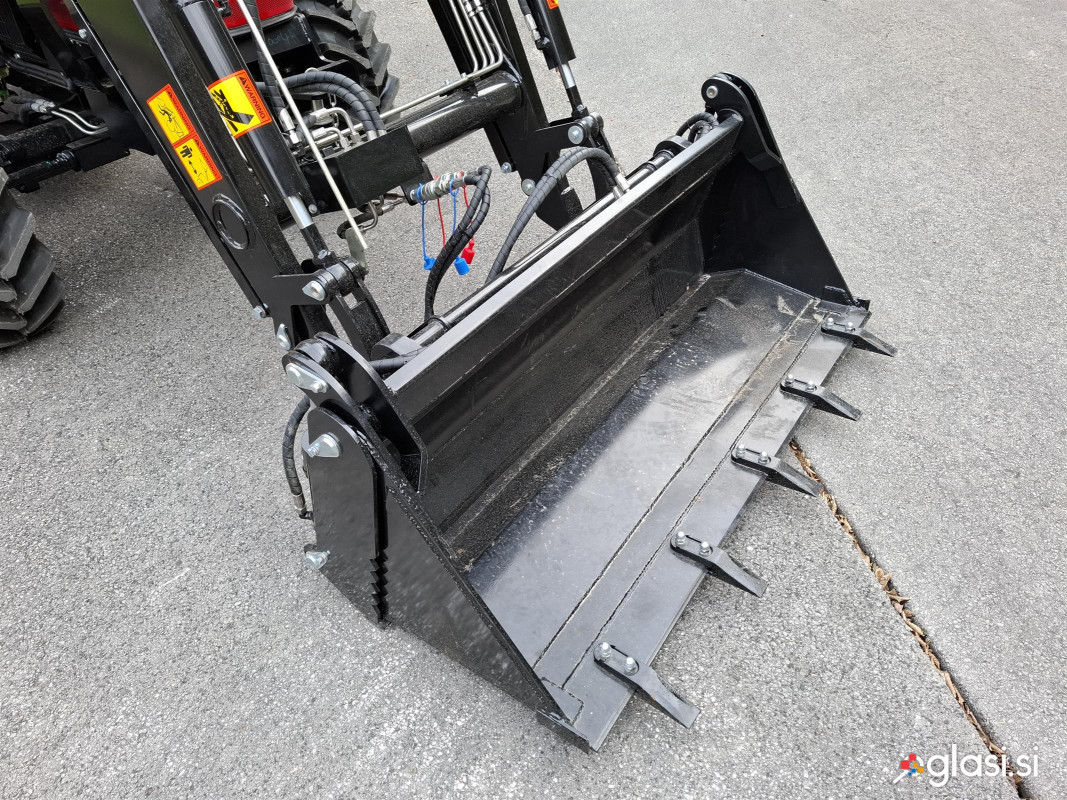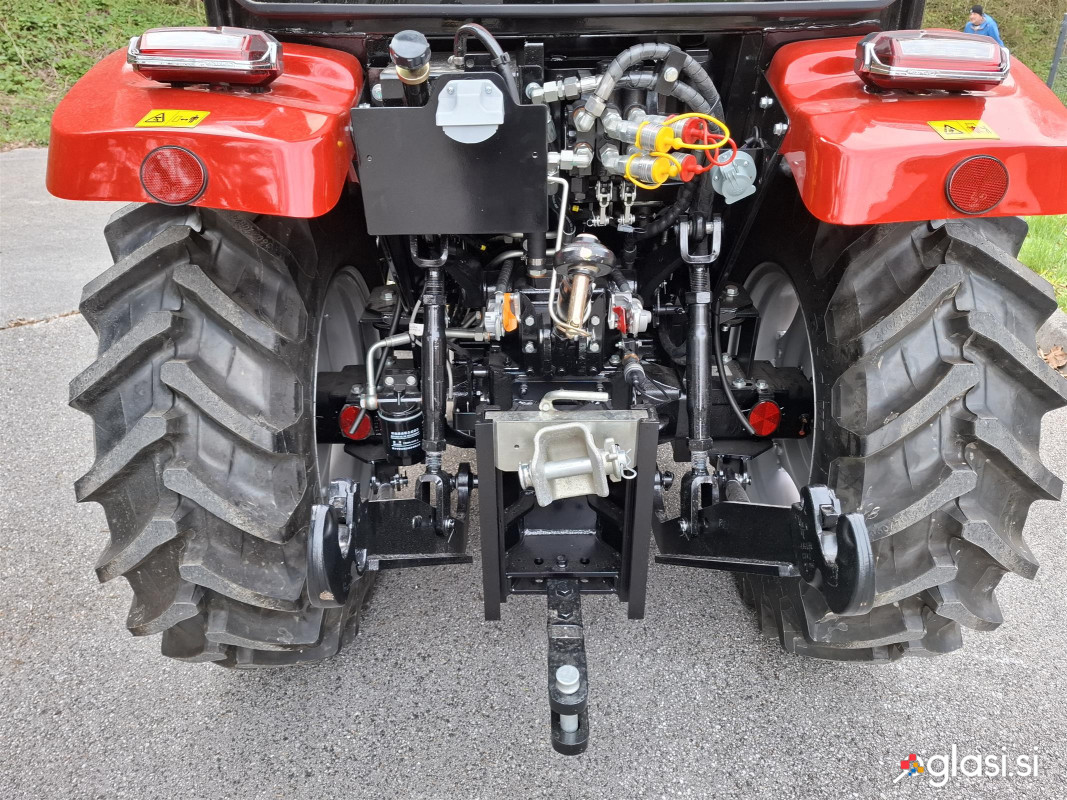 Traktor NTS 504-PRO s čelnim nakladačem ponuja 50 KM moči in emisijski standard EURO 5, ki zagotavljata visoko zmogljivost in okolju prijazno delovanje. V SBAY iz Grosuplja vam zagotavljamo 24 mesečno garancijo in celovito podporo. Štirikolesni pogon z možnostjo preklopa omogoča prilagodljivost na različnih terenih, luksuzna kabina z ergonomskimi rešitvami, klimatsko napravo in LED osvetlitvijo pa zagotavlja udobno in učinkovito delo. Sprednji čelni nakladač z nosilnostjo do 400 kg ter večnamenska 4V1 kibla, traktorju omogočata vsestranskost in fleksibilnost pri vseh vrstah opravil. NTS 504-PRO je idealen partner za vsakodnevne izzive na kmetiji in v gozdu. MOTOR: Znamka motorja: Yunnei Model motorja: DEF20CFF4 Emisijski standard: EURO 5 Nazivna moč: 36,8kW / 50KM Nazivni obrati motorja: 2400 r/min Max. navor: 190Nm Prostornina motorja: 2400cc Način vbrizga goriva: Turbo vbrizg DPF filter: Da POGONSKI SKLOP IN UPRAVLJANJE: Tip pogona: Štirikolesni pogon (možnost preklopa 4WD ali 2WD) Tip sklopke: Dvojna sklopka, Suha Tip krmiljenja: Hidravlični servo volan Tip diferenciala: Navadni mehanski Tip zavor: Mokre, Disk zavore Tip ročne-parkirne zavore: Navadna mehanska MENJALNIK: Število prestav (Naprej/Vzvratno): 8+8 Število hitrih prestav naprej: 4 Število počasnih prestav naprej: 4 Število hitrih prestav nazaj: 4 Število počasnih prestav nazaj: 4 Tip menjalnika: Navaden ročni delno sinhroniziran menjalnik, z invertejrem Končni prenos: vgrajen tip, enojni ravni cilindrični zobnik Max. hitrost: 28,37km/h Razpon hitrosti naprej: 1,99-28,37km/h Razpon hitrosti nazaj: 1.79-25.53km/h Količina menjalniškega olja: 30L HIDRAVLIČNI SISTEM, ZADNJE VPETJE in PRIKLJUČKI: Pretok hidravličnega olja: 36L/min Tri točkovno vpetje - priključno drogovje: Kategorija 1 Sistem vpenjanja: Spodnji točki z hitrovpenjalnimi-avtomatskimi kljukami, zgoraj navadni navojni Top-link Metoda prilagajanja tri točkovnega vpetja: Hidravlični nadzor položaja-višine in prosti plavajoči gib hidravlike Sila dviga tritočkovnega vpetja (okvir): 8,3kN Nosilnost dviga tritočkovnega vpetja: 840kg Tip kardana: zadnji Moč na kardanu: ≥29,8kW Hitrost vrtenja kardana: 540rpm / 1000rpm (2 hitrosti) Število zob kardana: 6 Hidravlični priključki: 2 para priključkov zadaj Rezervoar hidravličnega olja: Ločen rezervoar kapacitete 20L Priklop za prikolico: U-priklop Priključek za zračne zavore: Da Priključek za elektriko: Da DIMENZIJSKI PODATKI in MASA: Teža traktorja: 2420kg (brez čelnega nakladača) / 3090kg (z čelnim nakladačem) Celotna dolžina traktorja: 3810mm (brez čelnega nakladača) Celotna širina traktorja: 1495mm Celotna višina traktorja: 2596mm Medosna razdalja: 1809mm Razmik sprednja kolesa (center-center): 1180-1380mm Razmik Zadnja kolesa (center-center): 1200-1400mm Najmanjši odmik od tal: 215mm Radij obračanja: 3,5m Tip pnevmatik: Radialne Dimenzije sprednjih koles: 280 / 70 R16 Dimenzije zadnjih koles: 360 / 70 R24 Rezervoar goriva: 60L Poraba goriva podana pri maksimalni moči ter 2400 r/min: 7.83kg/h (9.3L/h) Sprednje uteži: 100kg Uteži na zadnjih kolesih: 56kg LASTNOSTI SPREDNJEGA ČELNEGA NAKLADAČA: Največja nosilnost: 400kg Širina kible: 1482mm Volumen kible: 0,2m3 Max. višina kipanja: 2000mm Max. globina zajema: 140mm Max. umik kipanja: 900mm Teža-masa skupaj z 4V1 kiblo: 670kg Tip priložene kible: Večfunkcijska 4V1 kibla z hidravličnim odpiranjem-zapiranjem (Funkcije: Zajemanje materiala, Kipanje materiala, Opcija grabeža-prijemala, Opcija poravnalne deske-pluga) Tip priklopa: EU priklop z mehanskim hitrim priklopom Hidravlična linija: Da, 1 par hidravličnih priključkov Sistem upravljanje: Joystick komanda v kabini TEHNIČNE LASTNOSTI: Klimatizacija-prezračevanje kabine: klimatska naprava za hlajenje, ventilacija, gretje kabine Oprema kabine: luksuzna ergonomska kabina z ravnim dnom, ergonomski nastavljiv sedež Grammer, nastavljiv volan, radio z ozvočenjem, osvetlitev, digitalni in analogni inštrumenti Žarometi: glavne luči, 4x delavne luči (2x spredaj, 2x zadaj), rotacijska luč Tip žarometov: v LED tehnologiji GARANCIJA 24 mesecev ali 1000 ur Za brezskrbno uporabo vam zagotavljamo celovito podporo: strokovni servis, možnost servisa na terenu ter stalno dobavljivost rezervnih delov. Z vami smo tudi po nakupu.