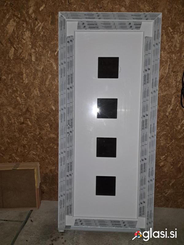 Vrata nova vhodna PVC salamander, profil (82mm), z 4 stopsol (bronza) stekli, 4 panti in metuljček cilindrom.