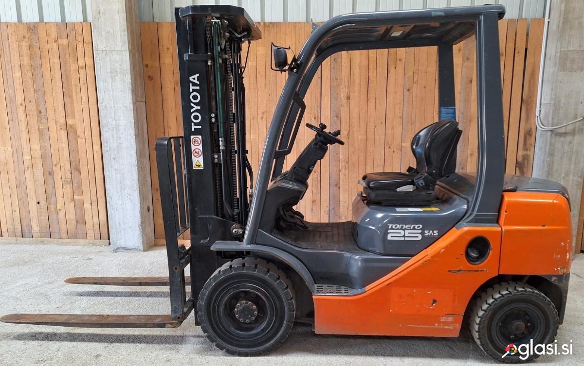 Viličar TOYOTA 02-8FDF25 samo 1529 h Nosilnost: 2500 kg Višina dviga 470 cm triplex, prosti dvig 160 cm, tretja linija Dolžina vilic: 120 cm Gradbena višina: 212 cm Polne gume Dolžina viličarja: 270 cm Širina viličarja: 110 cm Letnik: 2014