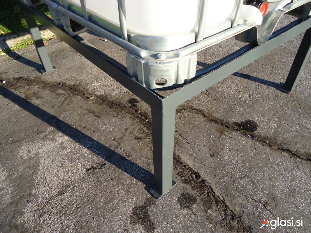 Podstavek, stojalo za IBC cisterno, iz močnega kotnega in oglatega jekla (debelina 5mm). Dimenzije podstavka so cca 100 x 120 cm ustrezne dimenzijam 1000 lit. IBC cisterne, da lepo in stabilno sede znotraj robov stojala. Konstrukcija zagotavlja stabilnost stalne obremenitve (+1200 kg) ter preprečuje možnost zdrsa cisterne s stojala. Višina podstavka je 40 cm in je idealna za natakanje 10 lit. zalivalke (preko ventila ali montirane pipe) ter za shranjevanje zalivalk pod stojalom. Podstavek je zaščiten s protikorozivno temeljno barvo ter prekrivno barvo v antracit odtenku. Podstavek je nov in še nerabljen.