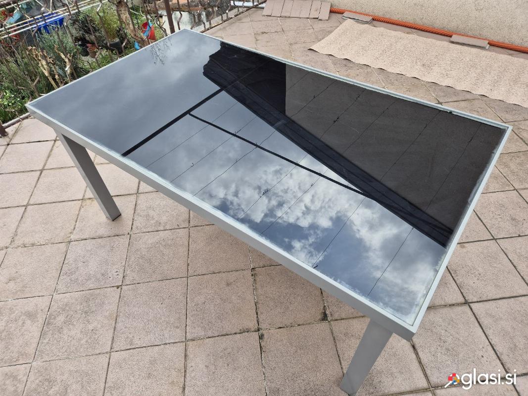 Miza, kombinacija aluminija in stekla, mere pa so 160x90, višina 72cm. Aluminijasto ogrodje je brezhibno in noge se da razstaviti, steklo ima pa le nekaj prask in se ga da tudi lepo pobrati iz okvirja.