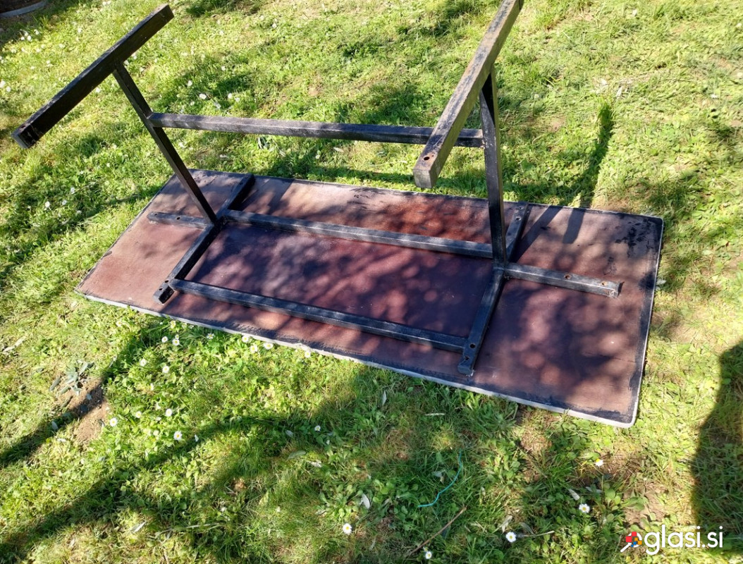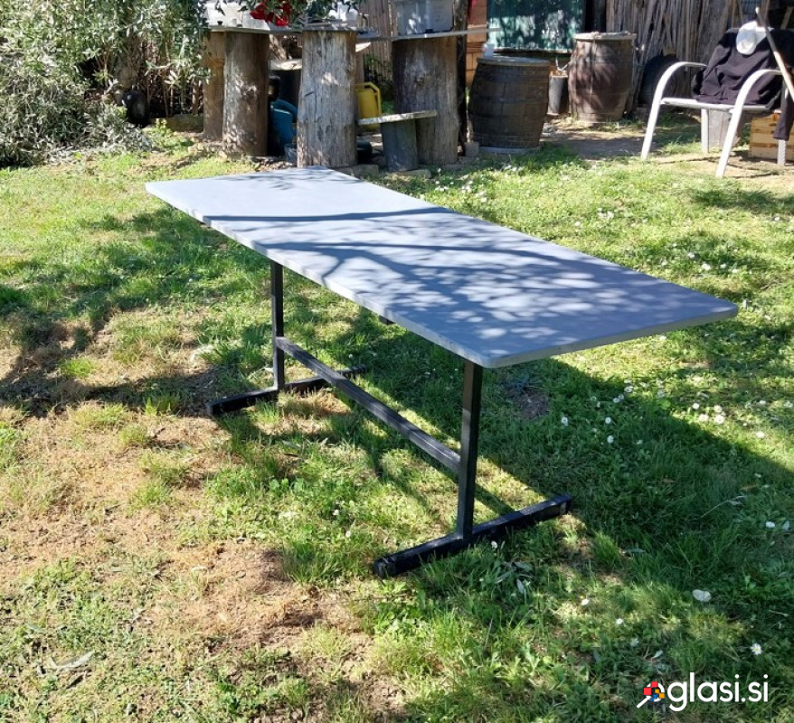 Vsestransko uporabna lesena vrtna miza s kovinskim podnožjem, lahko za na balkon, teraso, verando, vikend, klet, primerna za večjo družbo, ploskev iz vodoodpornega lesa debeline 2 cm, podnozje mocno, kovinsko, delana po naročilu.. Višina 70 cm. Potrebna manjšega čiščenja in in barvanja. Ogled v NG, možna dostava 10 - 15km za dodatno plačilo po 1eur /km.