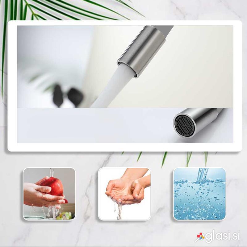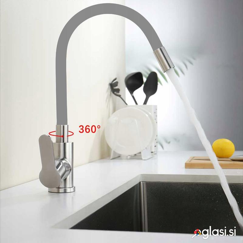 Glavna prednost tega modela je fleksibilen silikonski izliv, ki ga je mogoče poljubno oblikovati. To omogoča, da vodni curek doseže vsak kotiček pomivalnega korita. Pomivanje visokih loncev, izpiranje zelenjave ali polnjenje vrčev še nikoli ni bilo tako enostavno.