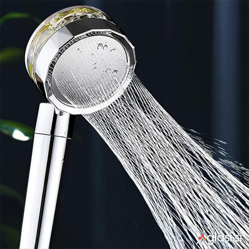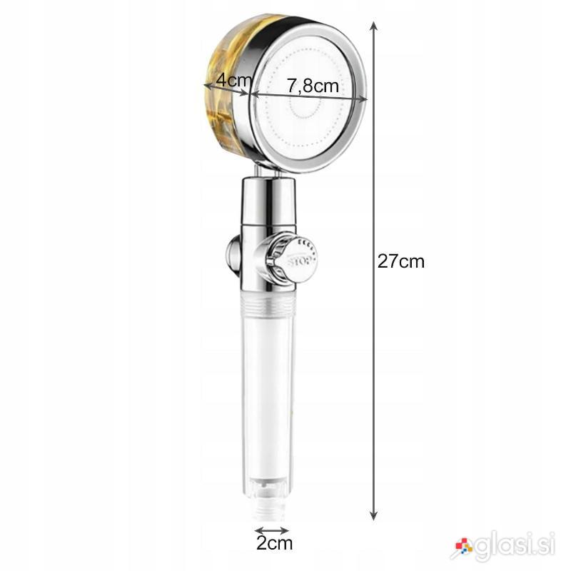 Kromirana tuš glava. Zasnovan za vgradnjo v standardno tuš cev. Slušalka ima klasično tuš funkcijo in STOP funkcijo, ki ustavi tok. Vgrajeni ventilator (turbina) poveča moč pršenja brez povečane porabe vode.