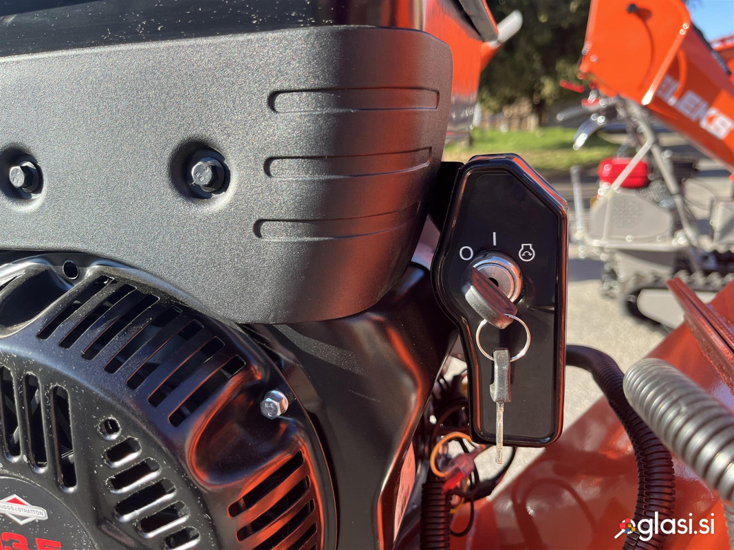 Drobilec vejevja motorni DELEKS DK800BS se ponaša z močjo 13.5 KM, kar omogoča učinkovito drobljenje tudi najtrših vej. Motor 13.5KM Briggs&Stratton XR2100 420cc zagotavlja zanesljivo delovanje. Z največjim premerom drobljenja do 120 mm, je ta drobilec primeren za obdelavo različnih vrst vrtnarskih odpadkov, vključno z debelimi vejami in grmovjem. Njegov napreden rezalni sistem, ki vključuje 2 skobeljna rezila in 1 nasprotno tolerančno topo rezilo, omogoča hitro in učinkovito drobljenje, kar pomeni manj časa za delo in več časa za uživanje v vašem vrtu. TEHNIČNI PODATKI: Model: NTS DK800BS Moč: 13.5 KM Motor: 13.5KM Briggs&Stratton XR2100 420cc, OHV, štiritaktni motor Obrati motorja: 3600rpm Gorivo: Bencin Rezervoar goriva: 6,5L Količina motornega olja: 1,1L Zaganjalnik: E-start 12V na akumulator in ročni reverzibilni zaganjač Največji premer drobljenja: do 120mm Opomba: Če je svež odrez vejevja, potem lahko upoštevamo max. premer 12cm. Faktor je tudi drevesna vrsta, temu se je potrebno prilagoditi. Če so veje suhe pa je priporočljiva obremenitev polovična, cca 5-6cm premera in posamično podajanje veje. Tip - rezalni sistem: Boben - skobeljno vreteno Število rezil: 2 skobeljna rezila na vretenu + 1 nasprotno tolerančno topo rezilo Sklopka: Centrifugalna sklopka Prenosni sistem: Jermenski, 2x klinasto zobata jermena Kolesi: 16*8.0-7 ATV Pnevmatski kolesi Teža neto: 200 kg Neto dimenzije d*š*v: 2870*837*1658mm Dimenzije paketa d*š*v: 900*770*1230mm Neto teža: 177 kg Bruto teža: 200 kg TEHNIČNE LASTNOSTI: Vlečna ruda s standardno bunko 50mm in velika pnevmatska kolesa za enostavno prevažanje. Tip rezalnega sistema na skobeljno vreteno - boben omogoča samodejni vlek materiala in zagotavlja manjšo možnost zabijanja. Centrifugalna sklopka katera se aktivira z povečevanjem obratov motorja, omogoča lažji zagon in zaustavitev stroja. Močan prenos preko dveh zobato klinastih jermenov. Izmetni žleb je nastavljiv levo-desno za 360° in gor-dol (višina-dolžina izmeta). Izmetni žleb ima višino izmeta 1650mm Na začetku podajalnega korita je zložljiv-podaljšani element kateri omogoča zaprtje korita kadar se stroja ne uporablja. Za delo pa se ga odpre in služi ob enem kot podaljšek korita. Korito je tudi na tečajih in se ga lahko odpre na stran za dostop do vizualnega pregleda, vzdrževanja,... Varnostno stikalo operaterju dostopno nameščeno na začetku zgornjega dela korita, omogoča hitro zaustavitev stroja. Velika pnevmatska kolesa in podložna guma na robustni oporni nogi zagotavljata dobro blaženje vibracij. Zložljiva oporna noga v transportni položaj. Premišljeni detajli glede dolgoročnega vzdrževanja stroja: Skobeljna noža imata rezalni rob z obeh strani, ob obrabi se lahko nože obrne. Enostaven sistem za vzdrževanje napetosti jermen.