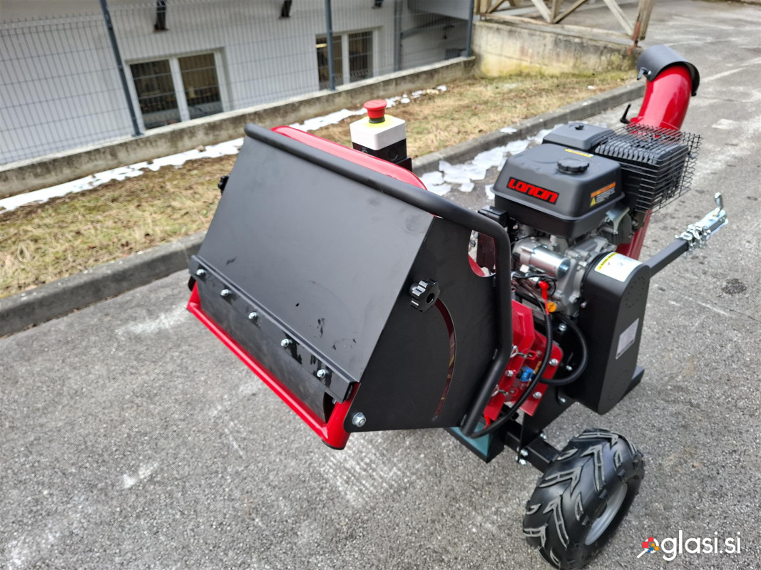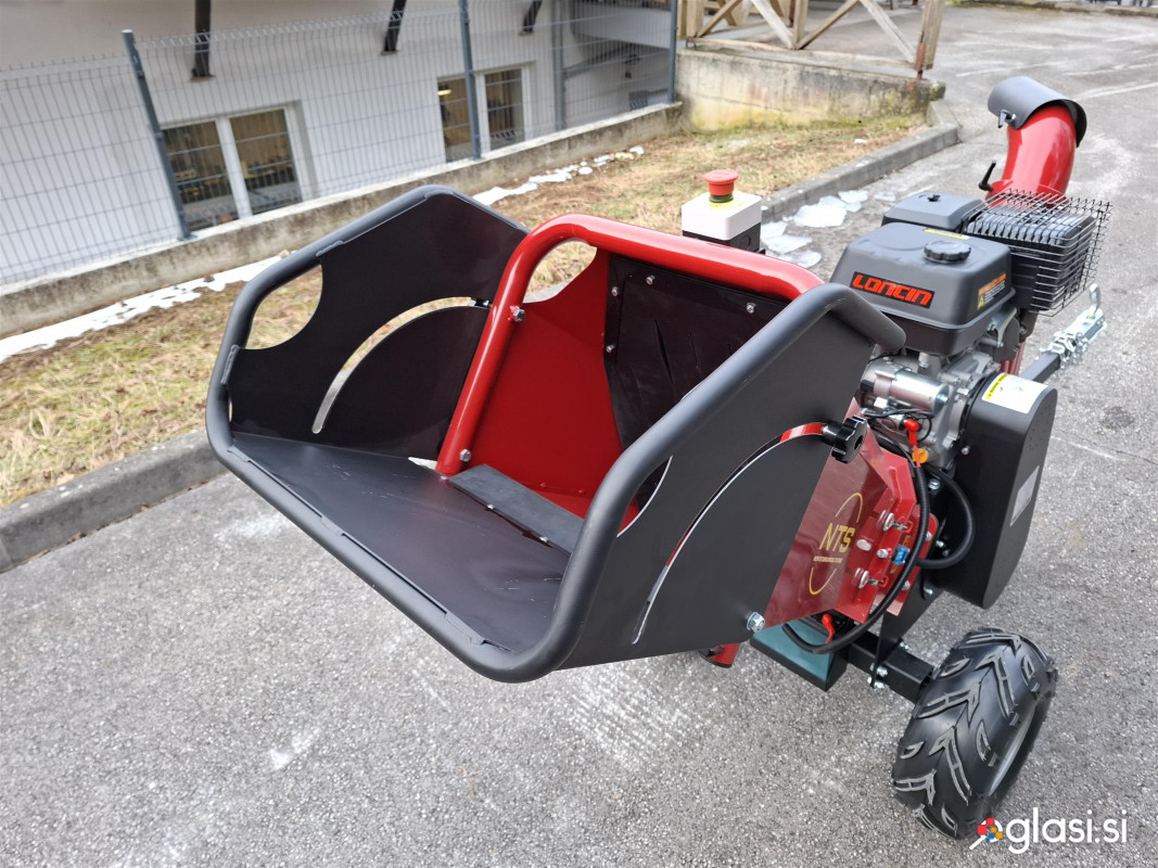 GARANCIJA 24 mesecev. Za brezskrbno uporabo vam zagotavljamo celovito podporo: strokovni servis, možnost servisa na terenu ter stalno dobavljivost rezervnih delov. Z vami smo tudi po nakupu. Drobilec vejevja NTS GS15002 je visoko zmogljiv motorni drobilec vejevja. S štiritaktnim motorjem Loncin, zmore zdrobiti vrtni odpad do maksimalnega premera 120mm v drobne koščke. S priročnim drogom za prevažanje in robustnimi pnevmatikami je odličen za delo na zahtevnejših terenih. TEHNIČNI PODATKI: Model: NTS GS15002 Moč: 15 KM Motor: LONCIN G420F, 420cc OHV, štiritaktni motor Obrati motorja: 3600rpm Gorivo: Bencin Rezervoar goriva: 6,5L Količina motornega olja: 1,1L Zaganjalnik: E-start 12V na akumulator in ročni reverzibilni zaganjač Največji premer drobljenja: do 120mm Opomba: Če je svež odrez vejevja, potem lahko upoštevamo max. premer 12cm. Faktor je tudi drevesna vrsta, temu se je potrebno prilagoditi. Če so veje suhe pa je priporočljiva obremenitev polovična, cca 5-6cm premera in posamično podajanje veje. Tip - rezalni sistem: Boben - skobeljno vreteno Število rezil: 2 skobeljna rezila na vretenu + 1 nasprotno tolerančno topo rezilo Sklopka: Centrifugalna sklopka Prenosni sistem: Jermenski, 2x klinasto zobata jermena Kolesi: 16*8.0-7 ATV Pnevmatski kolesi Teža neto: 200 kg Neto dimenzije d*š*v: 2560*890*1480mm Dimenzije paketa d*š*v: 900*770*1230mm Neto teža: 177 kg Bruto teža: 200 kg TEHNIČNE LASTNOSTI: Vlečna ruda s standardno bunko 50mm in velika pnevmatska kolesa za enostavno prevažanje. Tip rezalnega sistema na skobeljno vreteno - boben omogoča samodejni vlek materiala in zagotavlja manjšo možnost zabijanja. Centrifugalna sklopka katera se aktivira z povečevanjem obratov motorja, omogoča lažji zagon in zaustavitev stroja. Močan prenos preko dveh zobato klinastih jermenov. Izmetni žleb je nastavljiv levo-desno za 360° in gor-dol (višina-dolžina izmeta). Na začetku podajalnega korita je zložljiv-podaljšani element kateri omogoča zaprtje korita kadar se stroja ne uporablja. Za delo pa se ga odpre in služi ob enem kot podaljšek korita. Varnostno stikalo operaterju dostopno nameščeno na začetku zgornjega dela korita, omogoča hitro zaustavitev stroja. Velika pnevmatska kolesa in podložna guma na robustni oporni nogi zagotavljata dobro blaženje vibracij. Zložljiva oporna noga v transportni položaj. Premišljeni detajli glede dolgoročnega vzdrževanja stroja: Skobeljna noža imata rezalni rob z obeh strani, ob obrabi se lahko nože obrne. Enostaven sistem za vzdrževanje napetosti jermen.