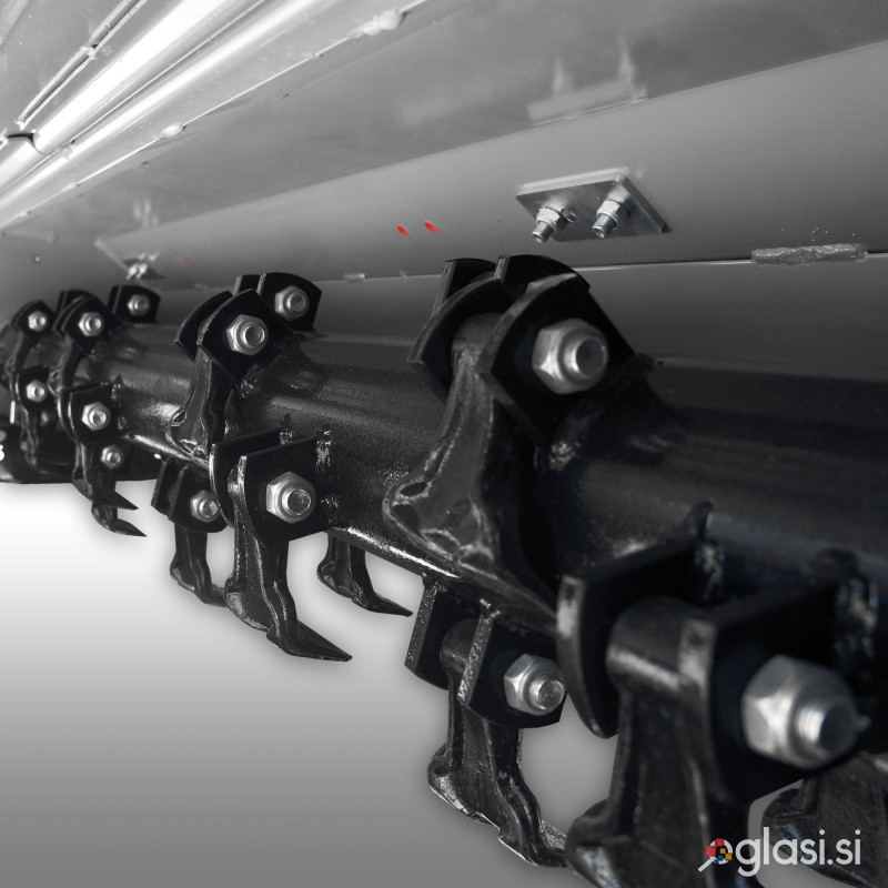 Traktorski mulčer EFGCH-220 Jansen delavne širine 210cm, gnan s strani traktorskega kardana. Vpetje je standardno tri točkovno. Mulčer je močne konstrukcije z robustnim reduktorjem in težkimi kladivi vpeti spiralno na močni osovini. Mulčer je opremljen tudi s hidravličnim bočnim zamikom levo/desno. TEHNIČNE LASTNOSTI: Pogon na traktorski kardan, kateri je tudi priložen. Tri točkovno vpetje. Močan robusten reduktor. 30 kladivnih rezil posebej poboljšanih teže 0,8kg/kos, vpeti spiralno okoli močne osovine. Mulčer je opremljen tudi s končnim valjerjem. Delavna višina je nastavljava z zgornjim kontrolorjem in na stranske drsnike. Spredaj so nameščene vzmetene pocinkane letvice, ki preprečujejo vstop kamenja. Hidravljični bočni zamik levo/desno za. Za to funkcijo mora imeti traktor lasten hidravlični sistem, za poganjanje cilindra na mulčerju, ki ima dvojno delujoč valj. TEHNIČNI PODATKI: Delavna širina: 2100mm Vpetje: 3 točkovno vpetje Pogon: Traktorski kardanski Moč traktorja: Minimalna 50KM Obrati: 540rpm Kardan: Kardan priložen Pogonski jermeni: 4 kosi Teža: 541kg Stranski hidravlični zamik: 125mm levo, 225mm desno Dimenzije bruto (lesen zaboj): 245x88x80 cm (DxŠxV)