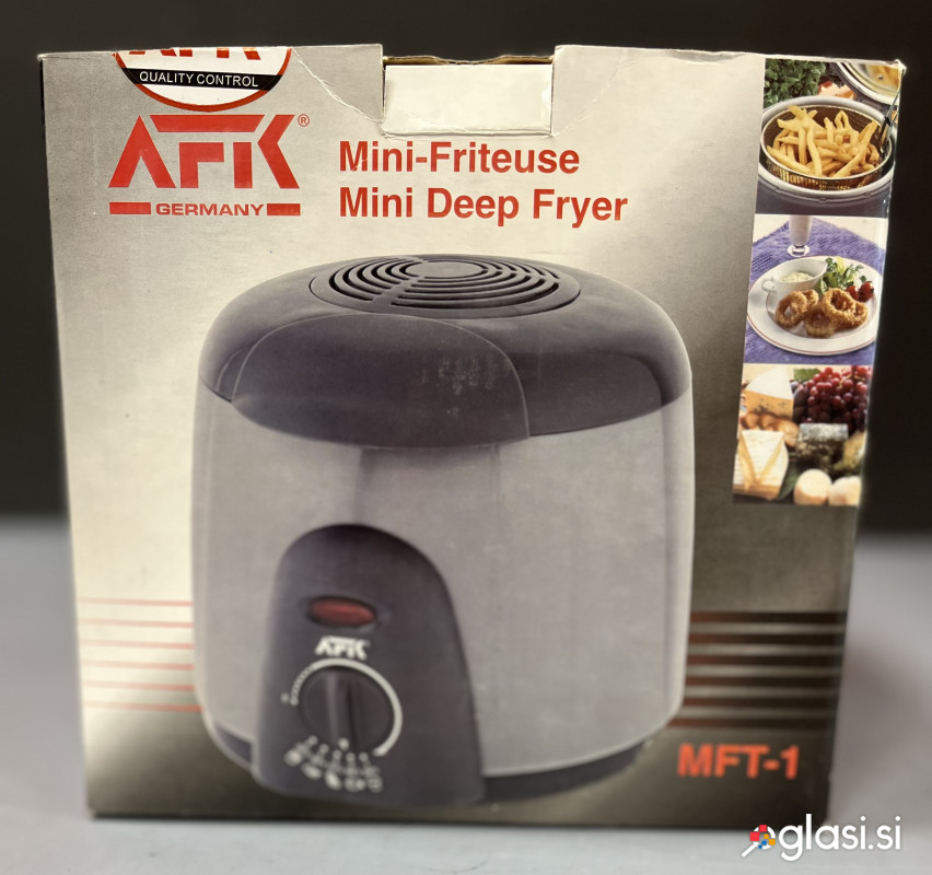 Friteza AFK, mini, kompaktna, idealna za pripravo manjših porcij doma. Nastavljiv termostat do ~190°C omogoča enostavno in natančno cvrtje. Nova, nerabljena v zaščitni foliji, priložena original embalaža in dodatki. Prevzem možen v Kranju/Lj, po dogovoru pošljem.