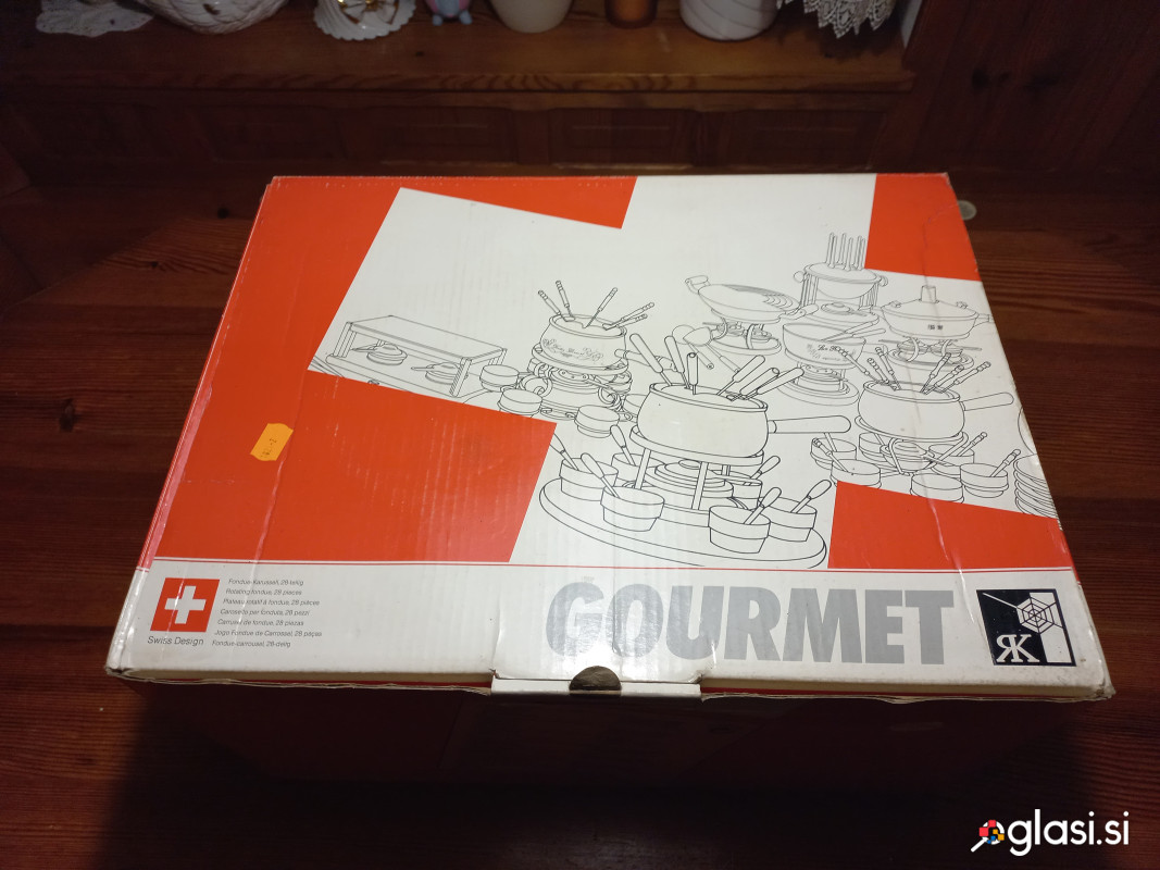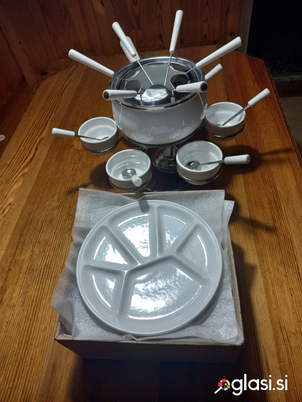 Fondi set: gorilnik, lonec, krožnike, skodelice za omako, nabodala-vilice Dodatne inf. na tel 041 520 318 ali zs