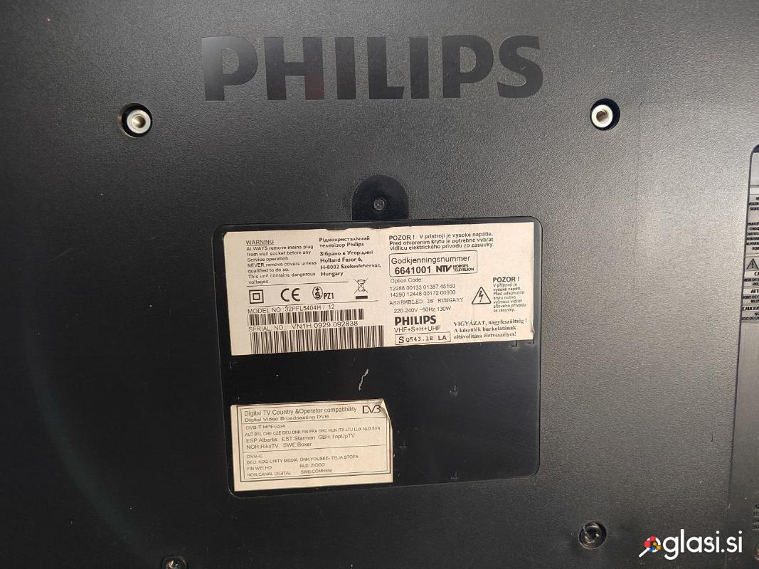 TV PHILIPS 32 PFL 5404H/12 LCD s Pixel Plus HD slikovno tehnologijo EKRAN/SLIKA: TV 32 PFL 5404H svetilnost 450 cd/m˛, razmerje kontrasta 50.000:1(dinamično), odzivnostni čas 5ms, kot gledanja 178/178 stopinj, diagonala 80cm/32 palce, Ločljivost 1366 x 768p , Pixel Plus HD, 3/2 - 2/2 motion pull down, 3D Combfilter, Active Control + Light sensor, Color Enhancement, Color Transient Improvement, Digital Noise Reduction, Dynamic contrast enhancement, Luminance Transient Improver, tuner: DVB: DVB-T zemeljski MPEG4*, DVB-C kabelski MPEG4* , ZVOK: - Izhodna moč (RMS): 2 x 10W - Incredible Surround, Treble and Bass Control - Zvočni sistem: Nicam Stereo FUNKCIJE: otročka ključavnica, samodejna nastavitev programov, teletekst 1000 strani spomina, načini prikazovanja slike (Auto Format, Movie expand 16:9, Super Zoom, Widescreen), pametni način izbire nastavitev glede na prikazovano vsebino Game, Cinema, Personal, Energy saving, Standard, Vivid), MULTIMEDIJA: možnost prikaza MP3, LPCM, JPEG Still pictures, MPEG1, MPEG2, H.264/MPEG-4 AVC DODATNI PRIKLOPI: •Ext 1 Scart: Audio L/R, CVBS in, RGB •Ext 2 Scart: Audio L/R, CVBS in, RGB •Ext 3: YPbPr, Audio L/R in •Front / Side connections: HDMI v1.3, S-video in, CVBS in, Audio L/R in, Headphone out, USB 2.0 •Audio constant level out, PC Audio in, PC-In VGA, S/PDIF out (coaxial), Common Interface DIMENZIJE: Š-V-G (mm) barva: črna z visokim sijajem, prozoren okvir teža: 10kg (s podstavkom 13kg) brez podstavka: 810 x 570 x 230 mm s podstavkom: 810 x 519 x 95 mm delovna poraba: 130W poraba v stanju pripravljenosti: 0,15W montaža: priloženo namizno stojalo opcija: stenska montaža: VESA 200 x 200 mm