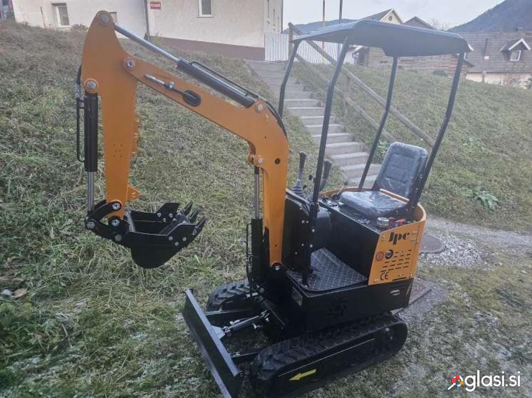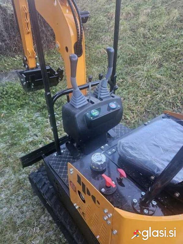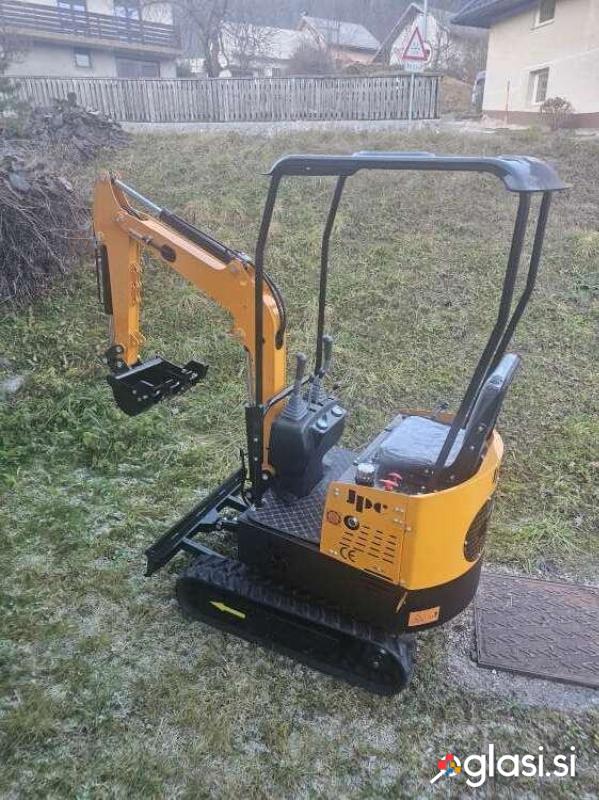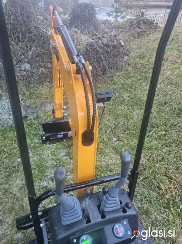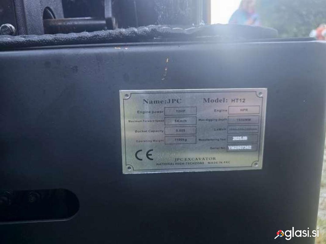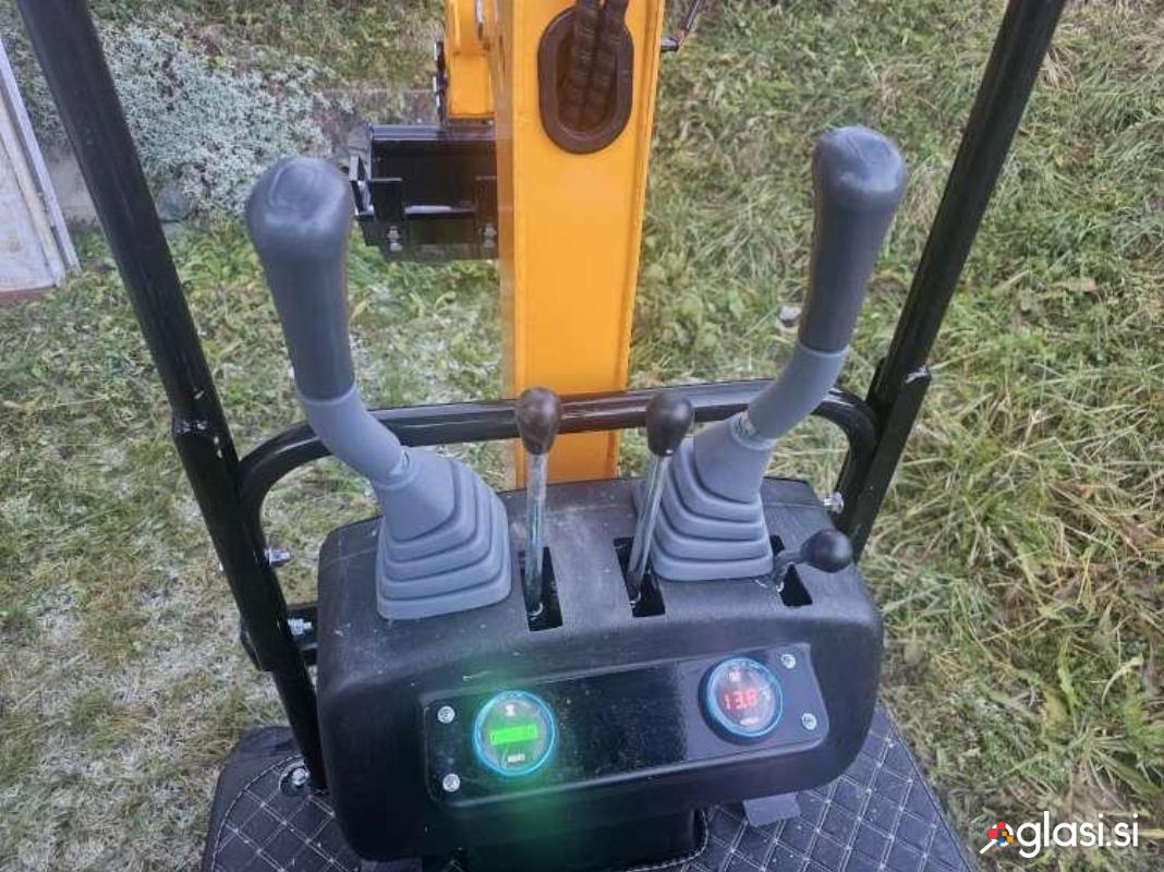 Mini bager goseničar (širina 92 cm), nerabljen – 0 delovnih ur, letnik 2025, dizel motor HPR moči 12 HP (konjskih moči), hitrost premikanja naprej 5 km/h, globina kopanja 1,65 m, vključena žlica širine 40 cm, teža 1.100 kg.