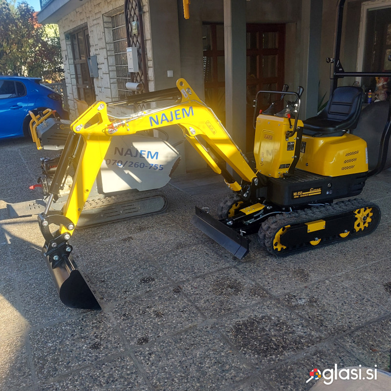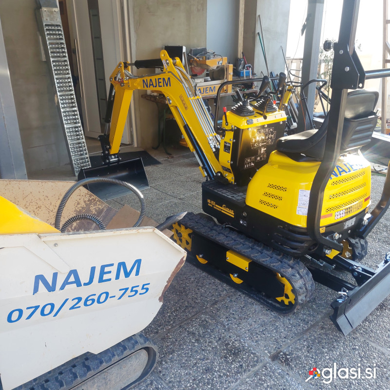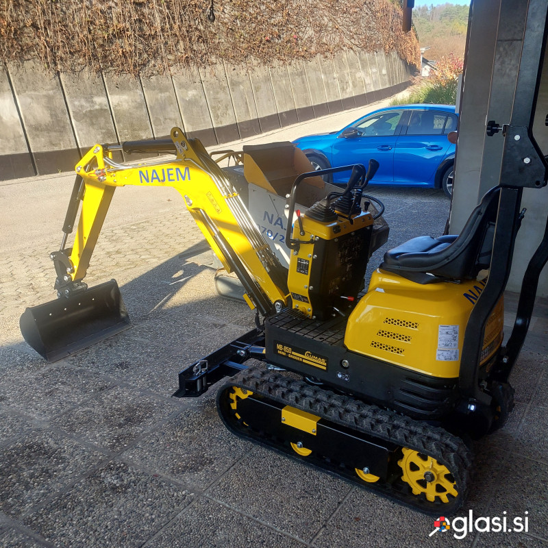 Oddam v najem mini bager 810 kg . Nastavljivo podvozje 720 na 880 mm. Bencinski motor 6,3 kW Najem vključuje: -kibla 33cm z zobmi -kibla 40cm ravna -kibla 70cm ravna -mehanska hitra menjava Dvig stroja je na Lavrici Cena za dnevni najem je 50,00 eur+DDV Udarno kladivo: 15 eur/dan Varščina: 300,00 eur Oglejte si še ostalo mojo ponudbo. Za ostale informacije me pa prosim pokličite na 070/260-755 Robi mini bager, mikro bager, izposoja bagrov, najem strojev.