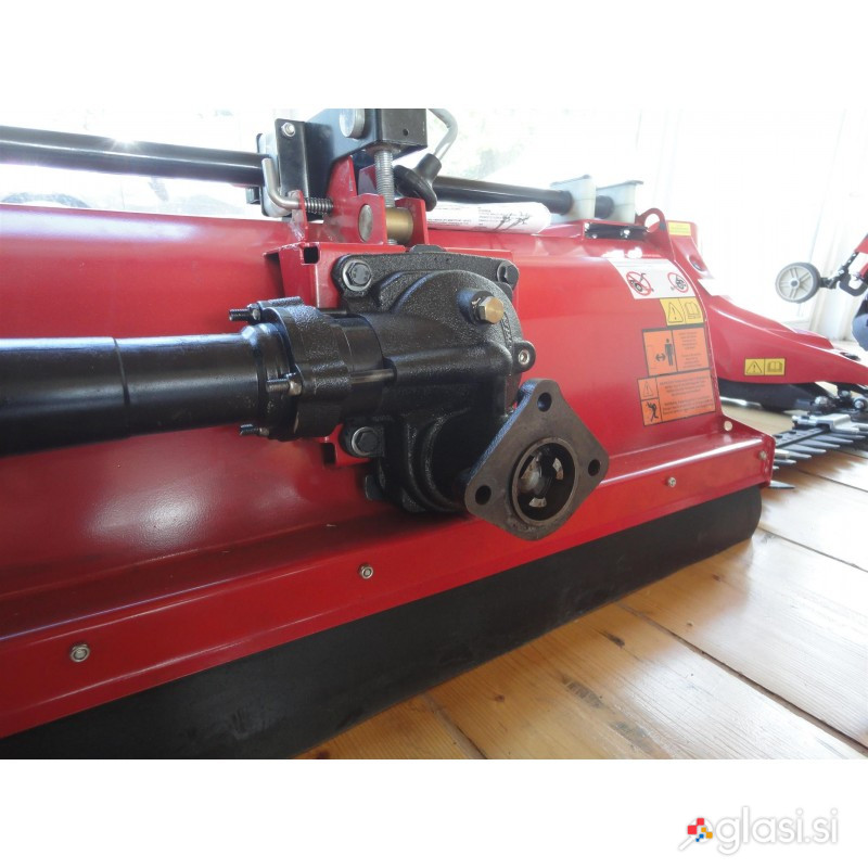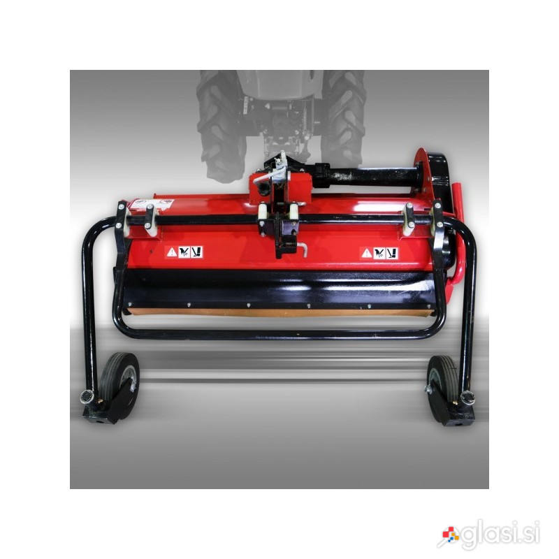 Mulčer primeren za motokultivator Jansen MGT-420 in za ostale znamke, kot so NTS, BCS, Pasquali, Ferrari. Delovna širina znaša 850mm, višina je z priročno ročico nastavljiva od 13 do100mm. Mulčer se uporablja za košnjo, čiščenje trave, za košenje v raznih nasadih,... Učinkovito košnjo zagotavljajo navpično nihajoča "Y" rezila. Kolesa so nastavljiva in zložljiva. TEHNIČNI PODATKI: Delovna širina: 600mm Delovna višina: 13-100mm Celotna širina priključka: 1120mm Tip nožev: "Y rezila" lebdeča, centrifugalna Število nožev: 15x Y-rezila (30 posameznih rezil) Prenos: zobniški v oljni kopeli in jermenski Teža neto: 85kg Teža bruto: 105kg TEHNIČNE LASTNOSTI: Robustna konstrukcija, primerno tudi za zahtevno košenje visoke trave, podrasti,... Možnost uporabe s sprednjimi kolesi, ki so vrteča in služijo distančno za višino košnje. Višino se enostavno dviga in spušča s pomočjo vrtljive ročice, ki se nahaja na sredini. Lahko se pa celotno konstrukcijo s kolesi zamakne nazaj in tako je valjar na tleh.