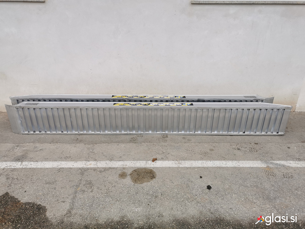 TEHNIČNI PODATKI: Model: RA170X40 Nosilnost: 7500 kg Dolžina: 4000 mm Teža para: 130 kg za par Notranja širina: 450 mm Zunaja širina: 512 mm Višina rampe: 40 mm TEHNIČNE LASTNOSTI: Material: Aluminij Brez roba