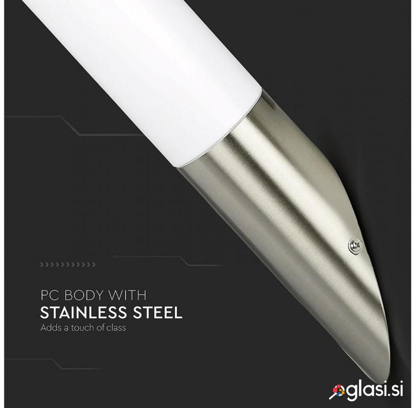Stenska svetilka iz nerjavečega jekla s plastičnim senčnikom za zunanjo uporabo.