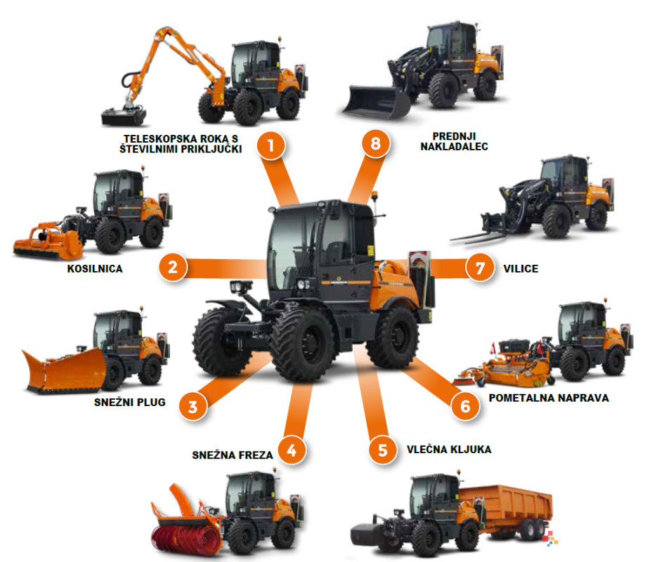 ILF KOMMUNAL je večfunkcijsko vozilo opremljeno s sistemom hitrega montažnega sistema, ki omogoča namestitev različnih oprem za vzdrževanje zelenih površin, gradbena dela in vzdrževanje cest v vseh letnih časih. Zahvaljujoč kabini in opremi na sprednji strani lahko operater uživa v maksimalni preglednosti in udobju. Poleg orodja na sprednji strani je mogoče urediti različne konfiguracije za upravljanje opreme tudi na zadnji strani. Osnovna ideja projekta ILF KOMMUNAL je izjemna stopnja konfiguracije. Hitri sistem montaže opreme omogoča hitro prenastavitev stroja, prehod iz ene vrste dela v popolnoma drugo, kar prinaša zmanjšanje stroškov. Poleg tega je po naročilu mogoče enostavno prilagoditi opremo tretjih proizvajalcev. IZJEMNA VIDLJIVOST Pri vstopu v kabino ILF KOMMUNAL prva presenetljiva značilnost je široko stekleno okno, ki omogoča maksimalno 360° vidljivost za popoln nadzor delovnega okolja. Nastavljiv volan, udoben sedež in intuitiven ter ergonomičen nadzorni sistem. STABILNOST - Stability Control Device Naprava za nadzor stabilnosti SCD (Stability Control Device) omogoča zaklepanje nihanja sprednje osi, povečanje stabilnosti stroja, da zagotovi največjo raven zmogljivosti in varnosti za operaterja. MOTOR - DEUTZ 173 KM ILF KOMMUNAL je opremljen z DEUTZ motorjem s štirimi valji in 143 KM (105 kW) s tekočinskim hlajenjem, zunanjim recirkuliranjem izpušnih plinov in emisijami po standardu EU Stopnja V. NATANČNO KRMILJENJE ILF KOMMUNAL je opremljen s sistemom štirikolesnega pogona, vse krmiljenje je hidravlično nastavljivo v treh različnih delovnih načinih: - 2 sprednji krmilni kolesi. - 4 krmilna kolesa, sistem, ki prepolovi območje obračanja stroja za delo na ozkih območjih. - 4 vzporedna krmilna kolesa (pasji hod), uporabna pri uporabi posebnega orodja ali za umik od ovire. Želite več informacij? Za brošuro o ILF KOMMUNAL, pošljite prošnjo na: matej.vidervol@rikoribnica.com DELOVNI ČAS: PON-PET 7:00 do 15:00 Možnost napak pri oddaji oglasa.