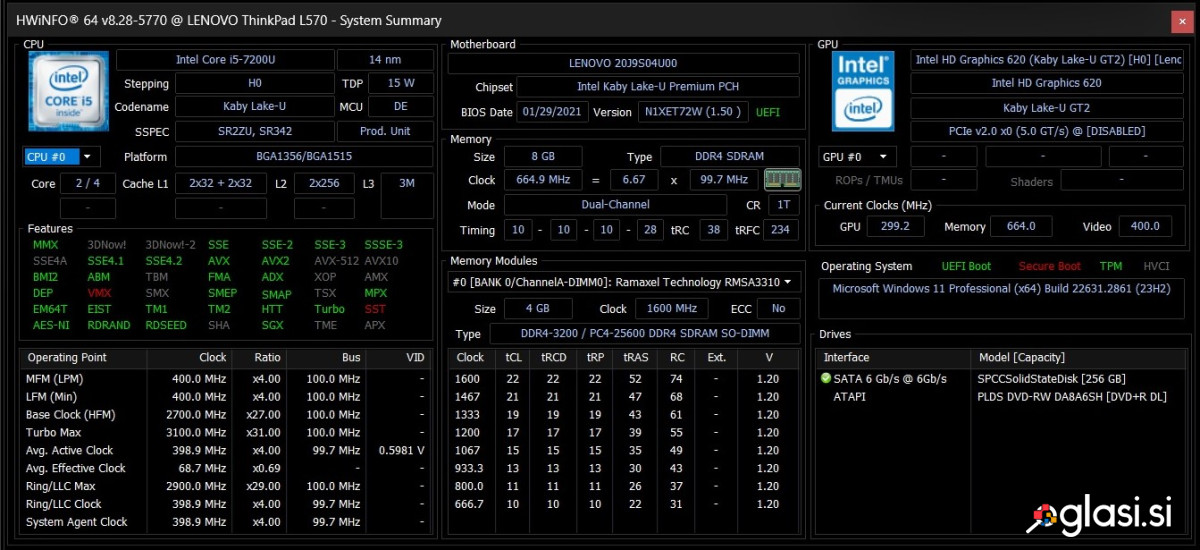 PRENOSNIK Lenovo Thinkpad L570 i5 7200u, 8GB RAM, SSD nov. Zaslon 15.6'' Anti-Glare Procesor Intel Core i5-7200u 2.7Ghz Turbo do 3.1Ghz Integrirana grafična Intel HD Graphics 620 RAM 8 GB DDR4 Nadgrajen SSD disk 256 GB Nov DVD+/- RW enota Spletna kamera z mikrofonom Čitalec kartic / Audio / 4xUSB / VGA / HDMI / LAN RJ45 Tipkovnica z vgrajeno številčnico Baterija še zelo dobra Priložen napajalnik Lepo ohranjen in nadgrajen prenosnik, nameščen je operacijski sistem Windows 11 Pro 64bit