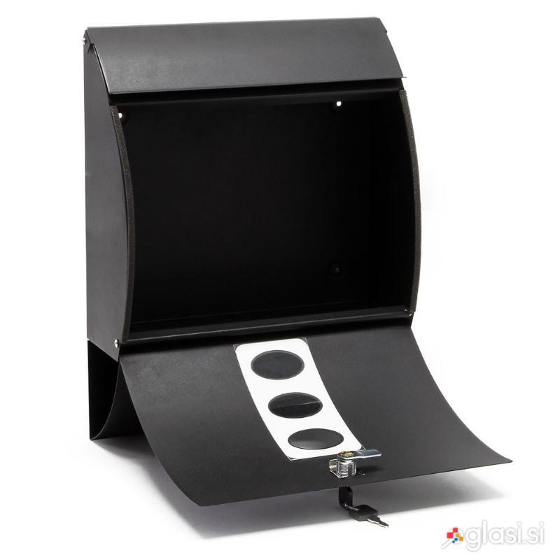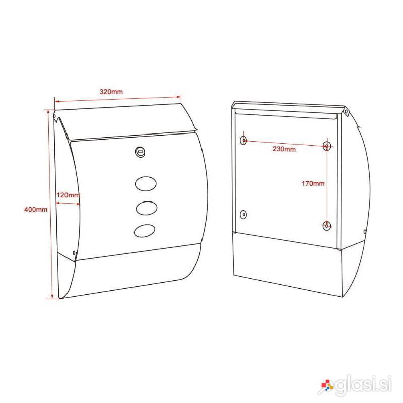 Dizajnerski poštni nabiralnik iz prevlečenega jekla z brezčasno elegantnim videzom. Nabiralnik ima veliko režo za pisma, je zaklenjen in ima dva ključa. Priložen je tudi montažni material. Na spodnji strani je tudi predal za časopise, tako da časopisov ni več treba puščati na mokrem pred vhodnimi vrati, temveč imajo suho mesto, dokler jih ne prinesejo v hišo.