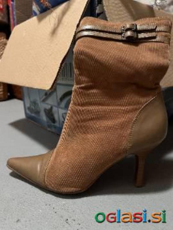 Škornje rjava barva, z visoko ozko peto, semiš, št.37, lepo ohranjeni.