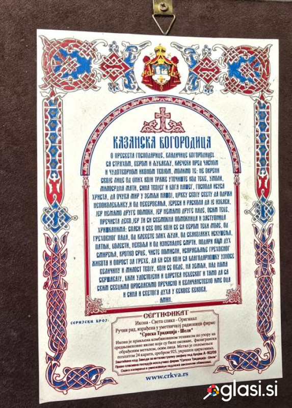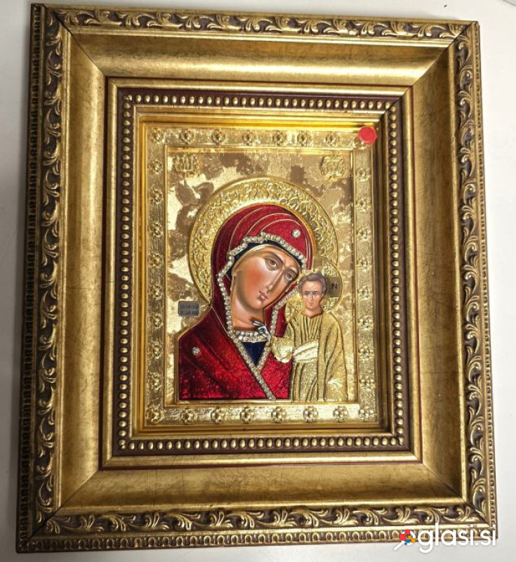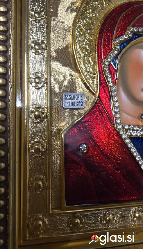 Ikona - Kazanska Mati Božja * izvirno ročno delo * potrdilo * ikona je izdelana v tehniki česanja po vzoru srednjeveških ikon * srebro s 24-karatnim pozlačenjem in vdelanimi cirkoni dimenzije 23 x 27 cm