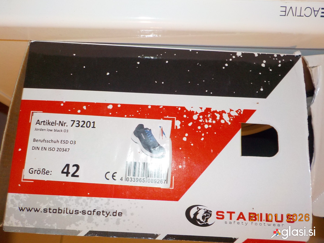 Čevlji, robustni, večnamenski, proizvajalec renomirani nemški, firme STABILUS, artikel št. 73201, velikost 42. Čevlji so popolnoma novi, v originalni embalaži, odporni na kemijo in v področju prstov ojačani. Podplat je antistatičen in zelo odporen na obrabo. Čevlji so udobni in mehki za uporabo.