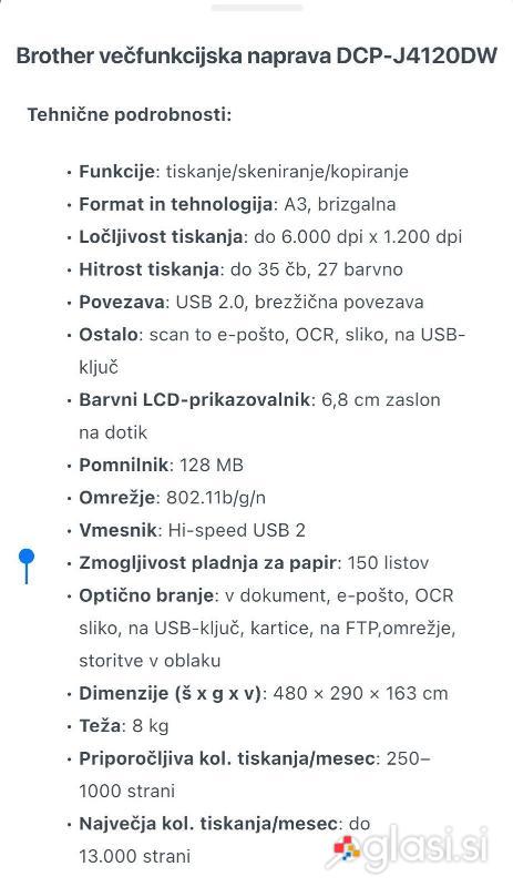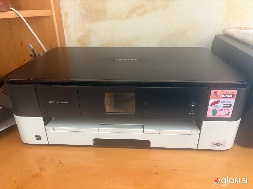Multifunkcijski tiskalnik Brother DCP-J4120DW v dobrem stanju. Primeren je tako za domačo kot manjšo poslovno uporabo. Omogoča 2-stransko tiskanje A4, z velikimi kartušami je možno natisniti do 1200 strani, enostavno optično branje in kopiranje. Tiskanje neposredno iz vašega računalnika ali mobilne naprave zahvaljujoč brezžičnem omrežju, ki dovoljuje enostavno tiskanje in optično branje kateremukoli uporabniku v vaši pisarni ali doma, ko to potrebuje. Dodam 4 xl črne kartuše in 3 xl barvne kartuše.